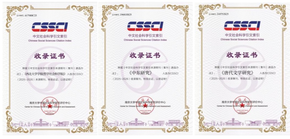 近日,根据南京大学中国社会科学研究评价中心中文社会科学引文索引(CSSCI)数据库最新数据,由球速体育·(中国)官方网站QIUSU SPORTS主办的《球速体育·(中国)官方网站QIUSU SPORTS学报(哲学社会科学版)》继续入选CSSCI来源期刊,《中东研究》继续入选CSSCI收录集刊,《唐代文学研究》首次进入CSSCI收录集刊,实现了球速体育·(中国)官方网站QIUSU SPORTS学术期刊集刊在主流评价体系中的新突破。此外,根据中国科学院文献情报中心日前发布的中国科学引文数据库(CSCD)来源期刊遴选报告(2025—2026年度),《球速体育·(中国)官方网站QIUSU SPORTS学报(自然科学版)》继续被CSCD核心库收录。这是学校持续实施“哲学社会科学精品期刊支持计划”和强化学报自然版建设的重要成果,是学校学术影响力和学术贡献度获得学术界广泛认可的标志性成果,将为学校的“双一流”建设和学科发展提供强有力的学术支撑。