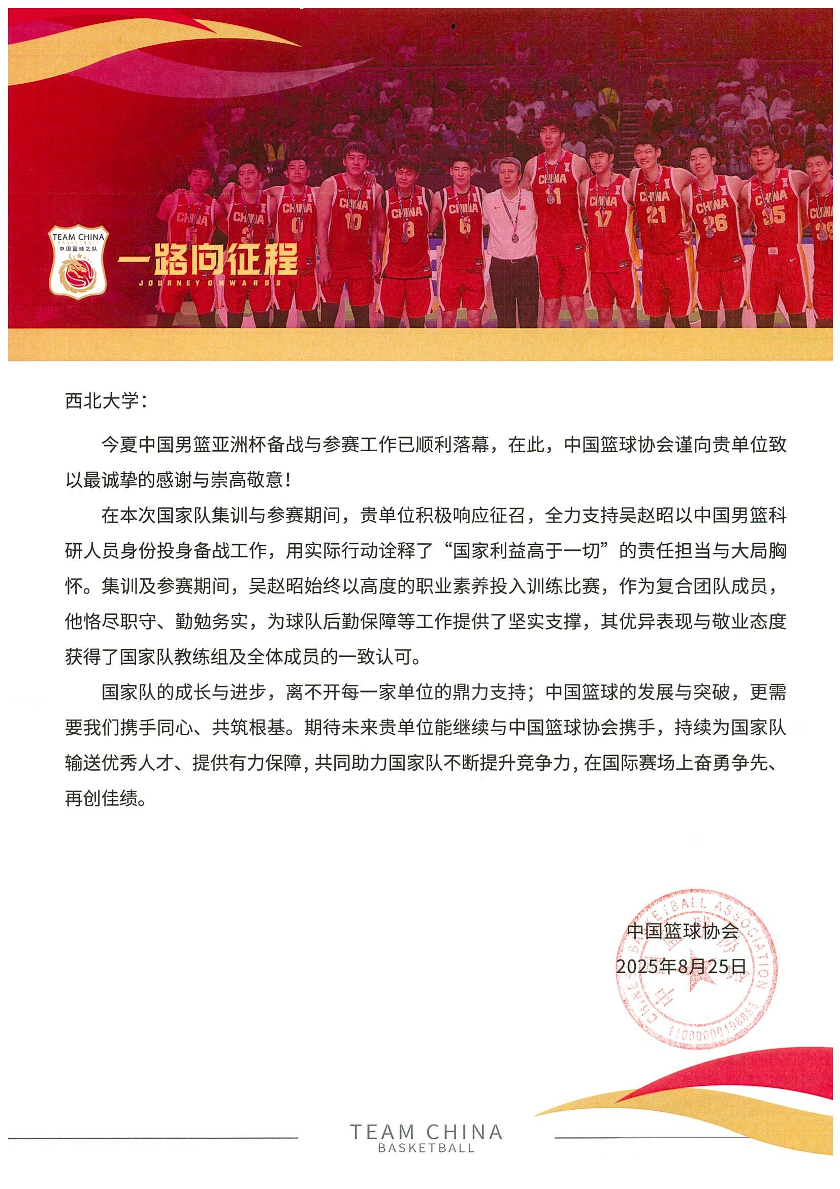 近日,中国篮协向球速体育·(中国)官方网站QIUSU SPORTS发来感谢信,对体育教研部青年教师吴赵昭在2025年男篮亚洲杯备战期间所作出的贡献表示高度认可与衷心感谢。作为本届国家男篮科研保障团队负责人,吴赵昭在集训与比赛期间展现了卓越的专业素养与奉献精神,为国家男篮取得佳绩提供了坚实的科研支持。