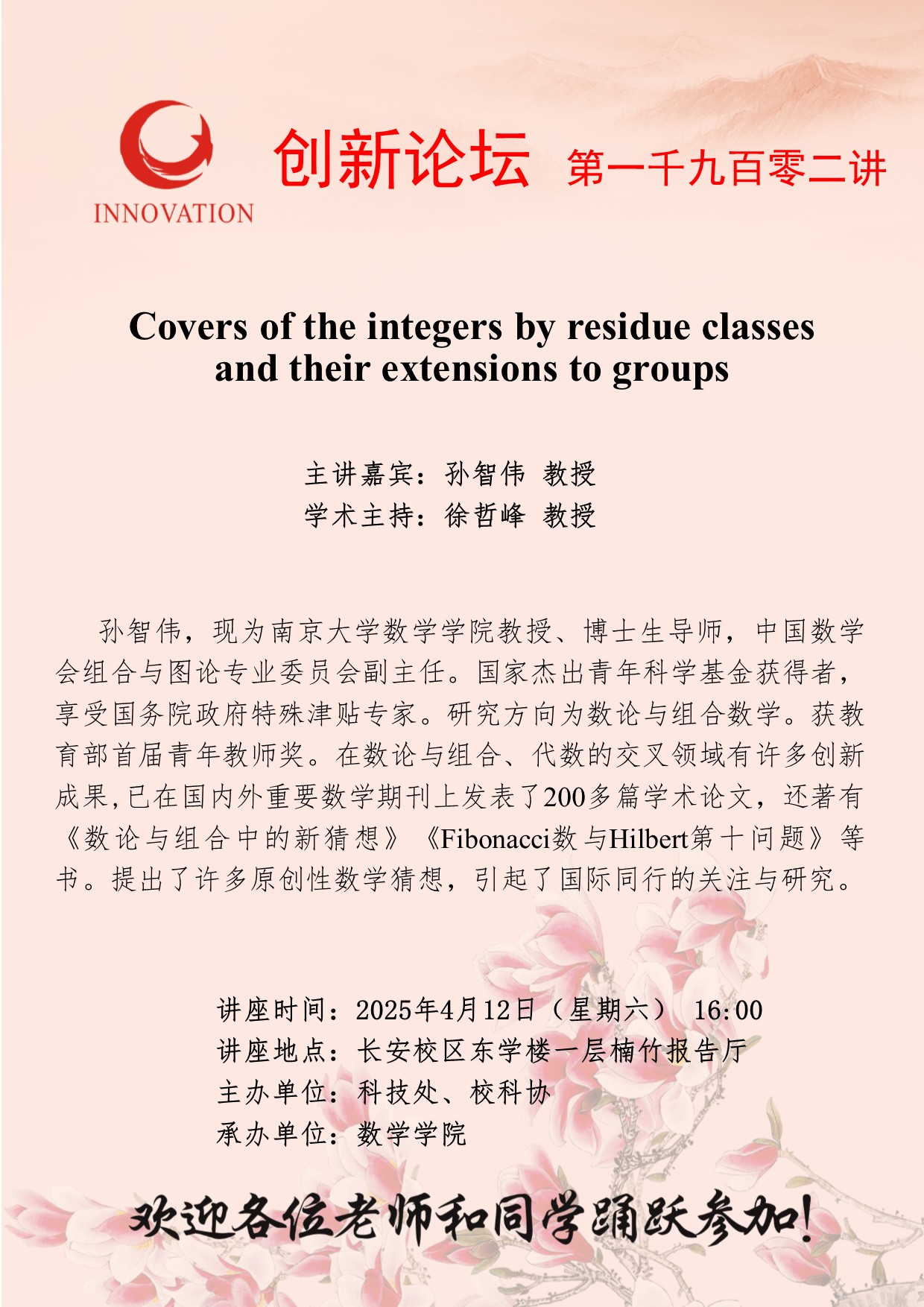 孙智伟 教授 球速体育·(中国)官方网站QIUSU SPORTS创新论坛第一千九百零二讲:Covers of the integers by residue classes and their extensions to groups 讲座时间 2025年4月12日(星期六) 16:00 讲座地点 长安校区东学楼一层楠竹报告厅 讲座人介绍 孙智伟 教授 讲座内容