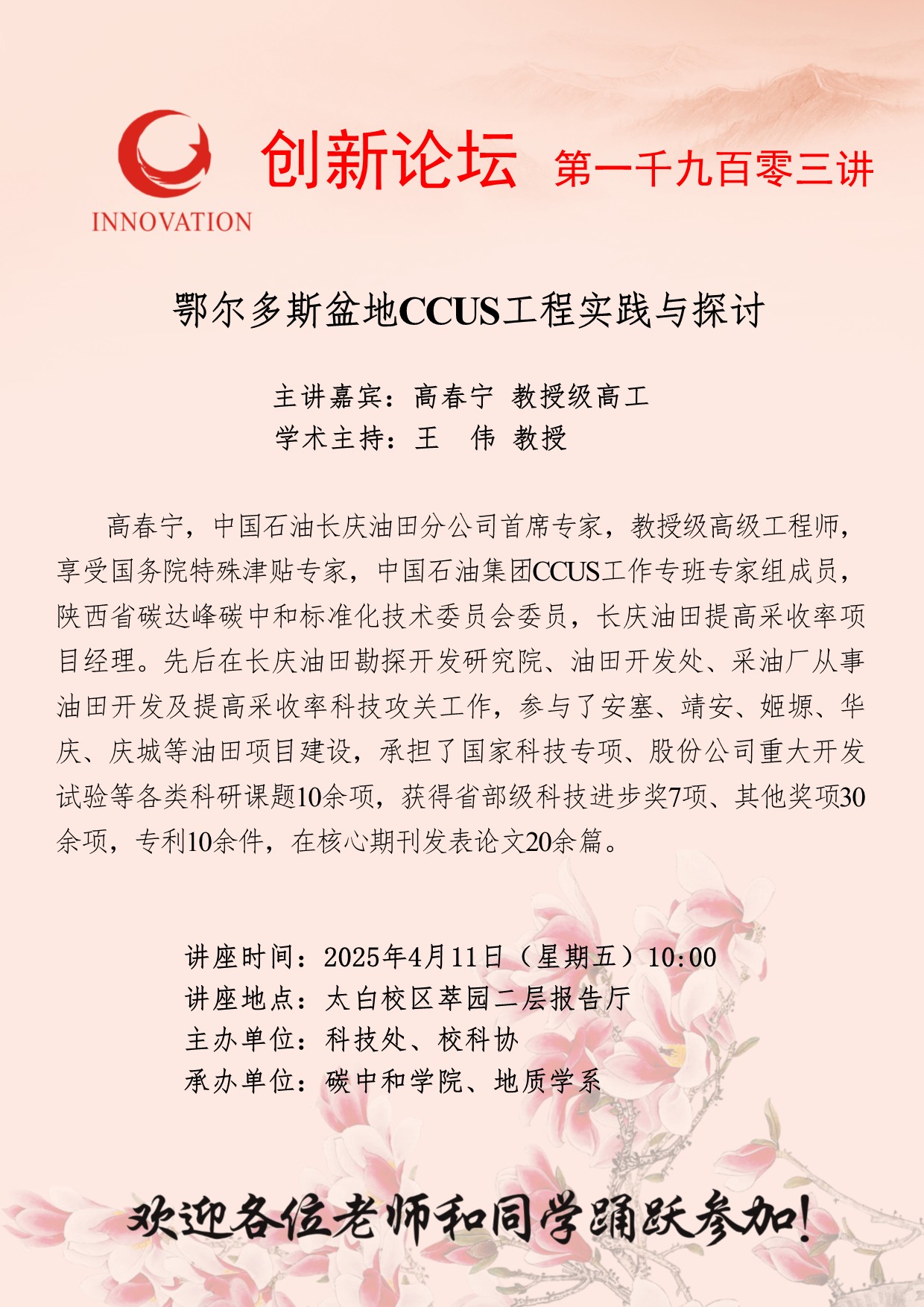 高春宁 教授级高工 球速体育·(中国)官方网站QIUSU SPORTS创新论坛第一千九百零三讲:鄂尔多斯盆地CCUS工程实践与探讨 讲座时间 2025年4月11日(星期五)10:00 讲座地点 太白校区萃园二层报告厅 讲座人介绍 高春宁 教授级高工 讲座内容