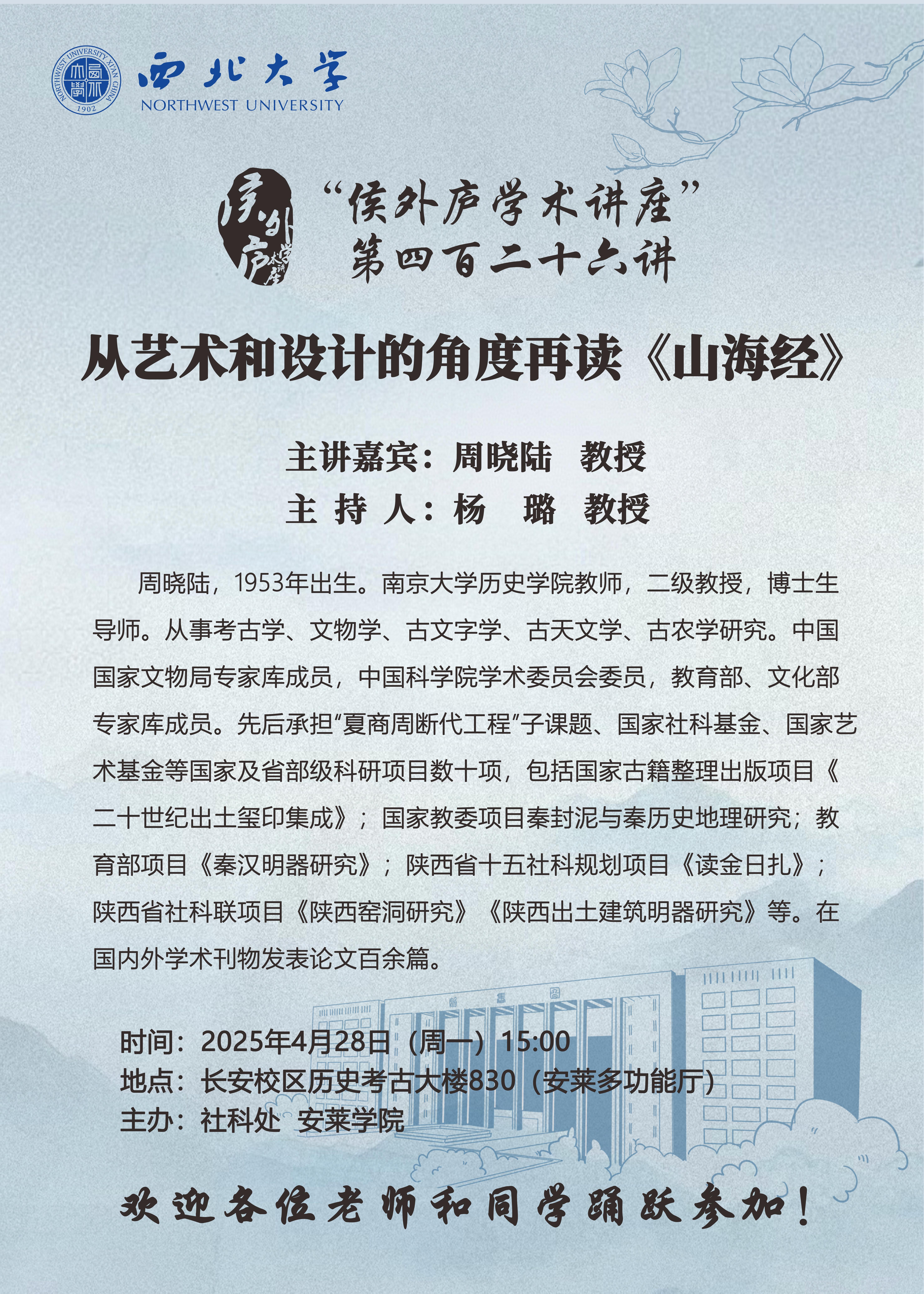 周晓陆 教授 “侯外庐学术讲座”第四百二十六讲:从艺术和设计的角度再读《山海经》 讲座时间 2025年4月28日(周一)15:00 讲座地点 长安校区历史考古大楼830(安莱多功能厅) 讲座人介绍 周晓陆 教授 讲座内容