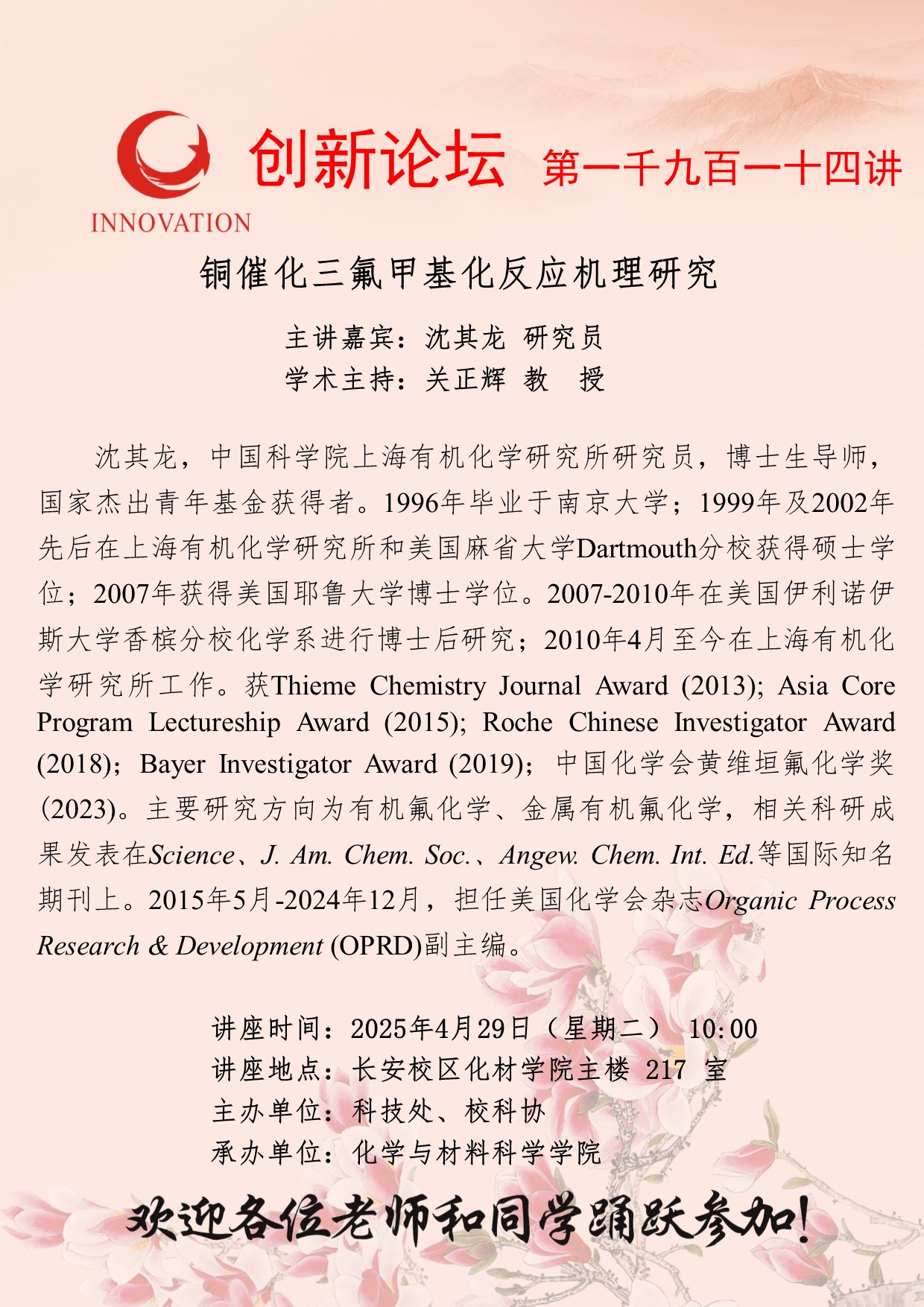 沈其龙 研究员 球速体育·(中国)官方网站QIUSU SPORTS创新论坛第一千九百一十四讲:铜催化三氟甲基化反应机理研究 讲座时间 2025年4月29日(星期二) 10:00 讲座地点 长安校区化材学院主楼 217 室 讲座人介绍 沈其龙 研究员 讲座内容