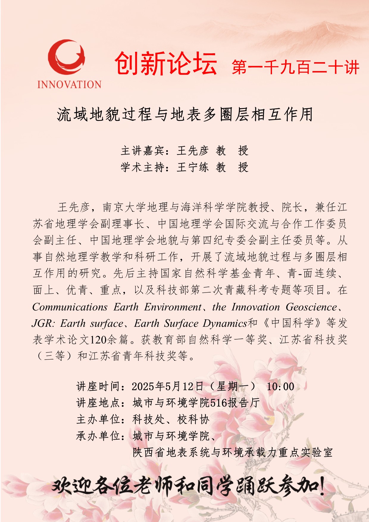 王先彦 教授 球速体育·(中国)官方网站QIUSU SPORTS创新论坛第一千九百二十讲:流域地貌过程与地表多圈层相互作用 讲座时间 2025年5月12日(星期一) 10:00 讲座地点 城市与环境学院516报告厅 讲座人介绍 王先彦 教授 讲座内容