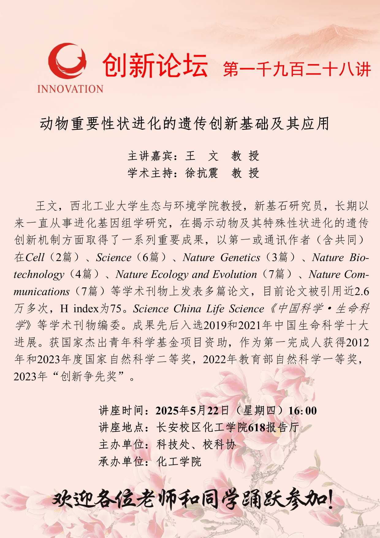 王文 教授 球速体育·(中国)官方网站QIUSU SPORTS创新论坛第一千九百二十八讲:动物重要性状进化的遗传创新基础及其应用 讲座时间 2025年5月22日(星期四)16:00 讲座地点 长安校区化工学院618报告厅 讲座人介绍 王文 教授 讲座内容