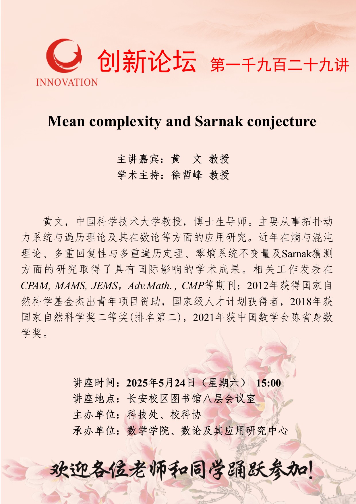 黄文 教授 球速体育·(中国)官方网站QIUSU SPORTS创新论坛第一千九百二十九讲:Mean complexity and Sarnak conjecture 讲座时间 2025年5月24日(星期六) 15:00 讲座地点 长安校区图书馆八层会议室 讲座人介绍 黄文 教授 讲座内容