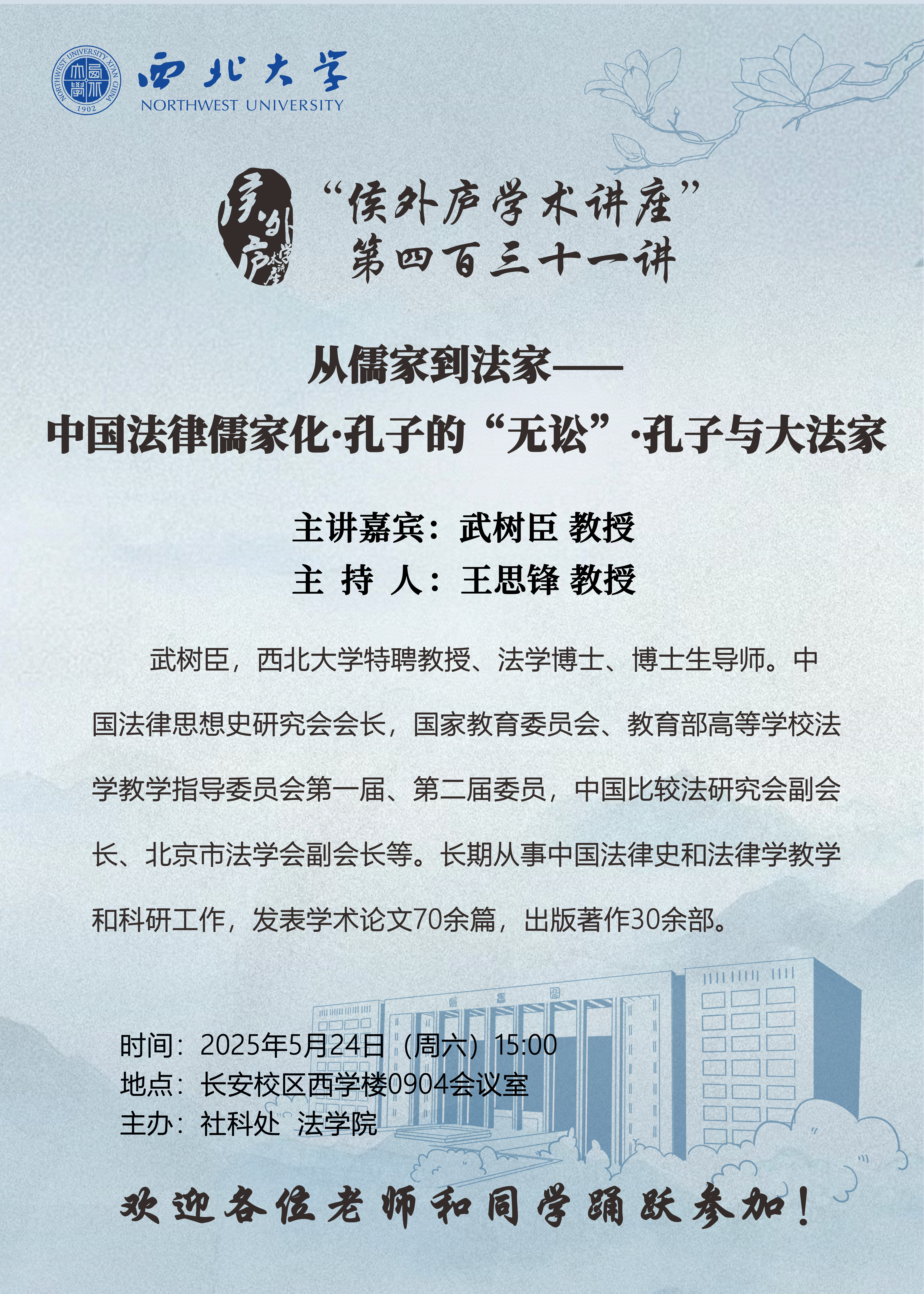 武树臣 教授 “侯外庐学术讲座”第四百三十一讲:从儒家到法家—中国法律儒家化·孔子的“无讼”·孔子与大法家 讲座时间 2025年5月24日(周六)15:00 讲座地点 长安校区西学楼0904会议室 讲座人介绍 武树臣 教授 讲座内容