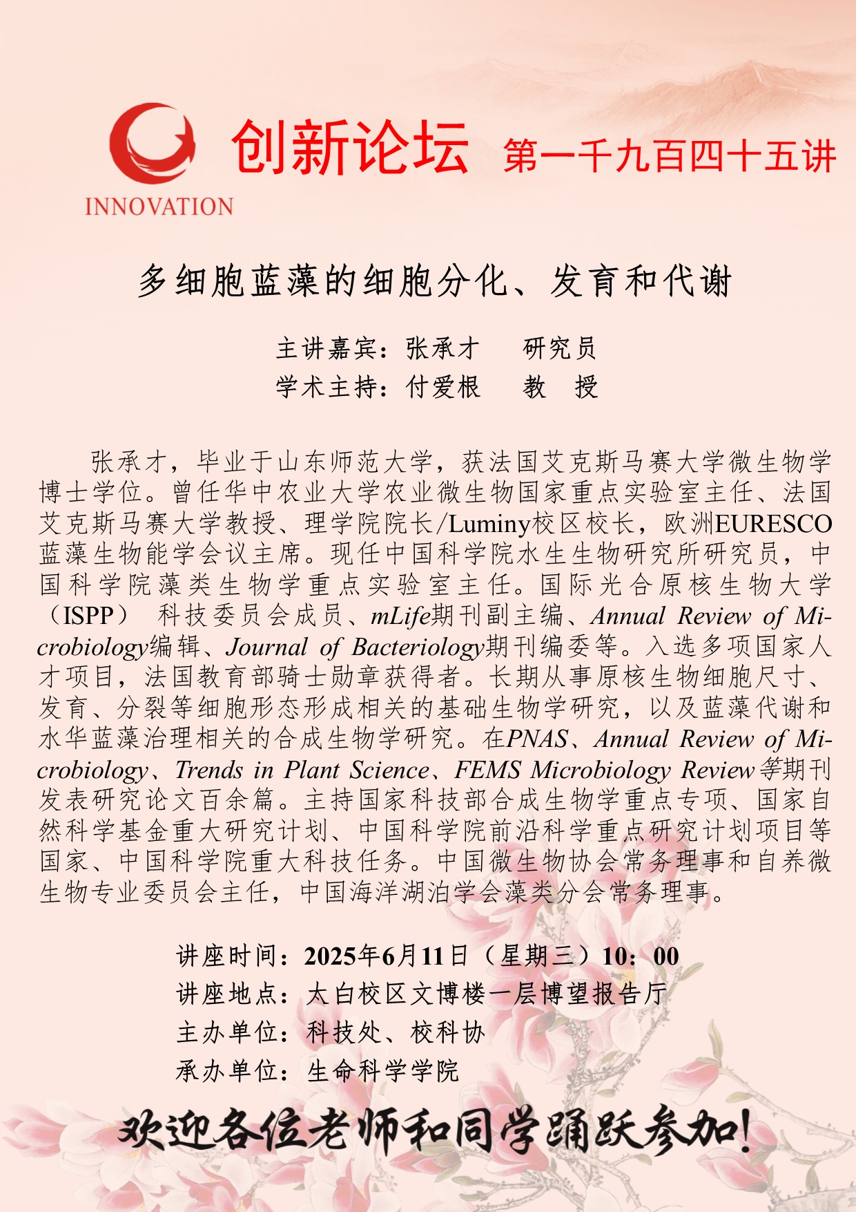 张承才 研究员 球速体育·(中国)官方网站QIUSU SPORTS创新论坛第一千九百四十五讲:多细胞蓝藻的细胞分化、发育和代谢 讲座时间 2025年6月11日(星期三)10:00 讲座地点 太白校区文博楼一层博望报告厅 讲座人介绍 张承才 研究员 讲座内容