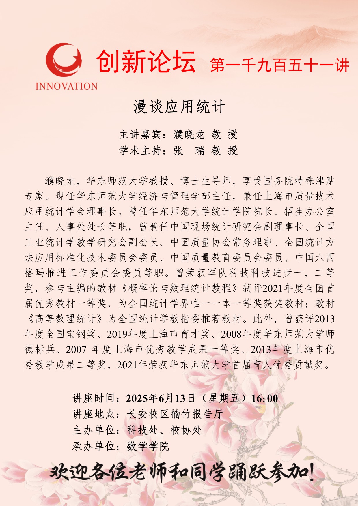濮晓龙 教授 球速体育·(中国)官方网站QIUSU SPORTS创新论坛第一千九百五十一讲:漫谈应用统计 讲座时间 2025年6月13日(星期五)16:00 讲座地点 长安校区楠竹报告厅 讲座人介绍 濮晓龙 教授 讲座内容
