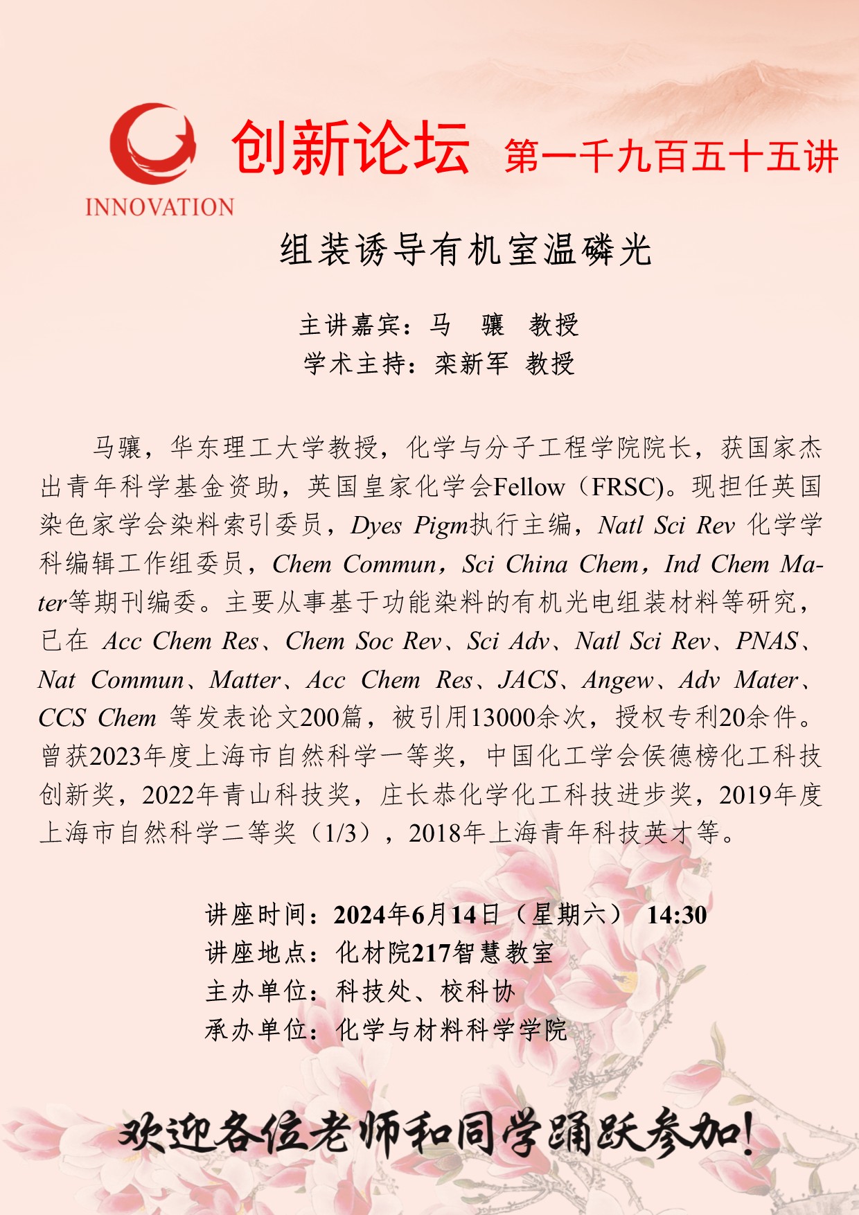 马骧 教授 球速体育·(中国)官方网站QIUSU SPORTS创新论坛第一千九百五十五讲:组装诱导有机室温磷光 讲座时间 2024年6月14日(星期六) 14:30 讲座地点 化材院217智慧教室 讲座人介绍 马骧 教授 讲座内容