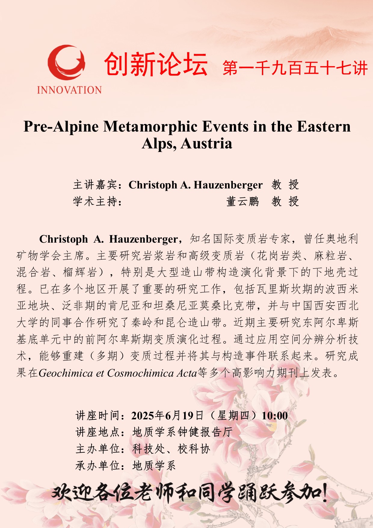 Christoph A. Hauzenberger 教授 球速体育·(中国)官方网站QIUSU SPORTS创新论坛第一千九百五十七讲:Pre-Alpine Metamorphic Events in the Eastern Alps, Austria 讲座时间 2025年6月19日(星期四)10:00 讲座地点 地质学系钟健报告厅 讲座人介绍 Christoph A. Hauzenberger 教授 讲座内容