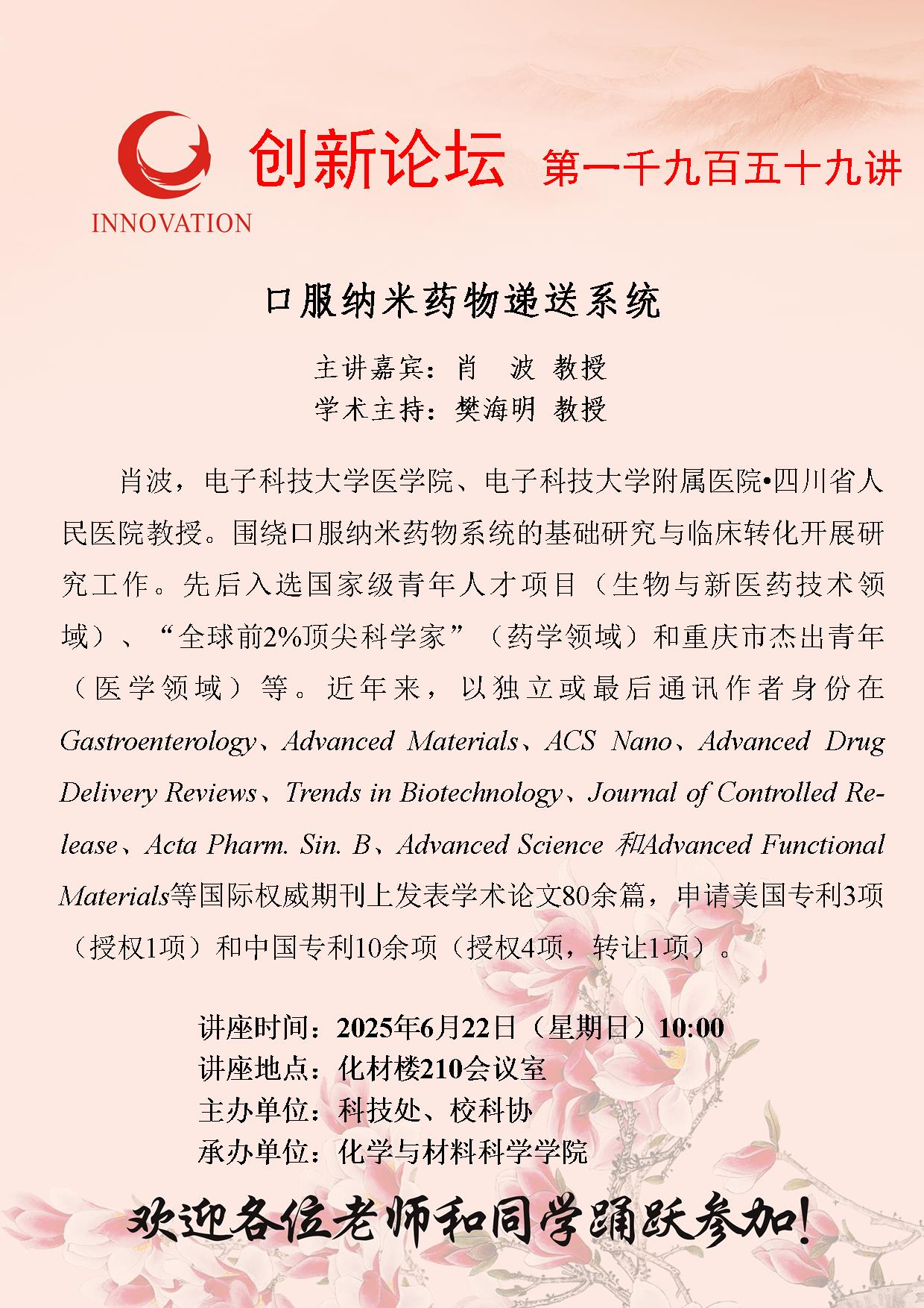 肖波 教授 球速体育·(中国)官方网站QIUSU SPORTS创新论坛第一千九百五十九讲: 口服纳米药物递送系统 讲座时间 2025年6月22日(星期日)10:00 讲座地点 化材楼210会议室 讲座人介绍 肖波 教授 讲座内容