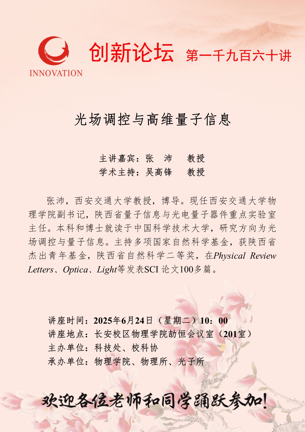 张沛 教授 球速体育·(中国)官方网站QIUSU SPORTS创新论坛第一千九百六十讲:光场调控与高维量子信息 讲座时间 2025年6月24日(星期二)10:00 讲座地点 长安校区物理学院劼恒会议室(201室) 讲座人介绍 张沛 教授 讲座内容