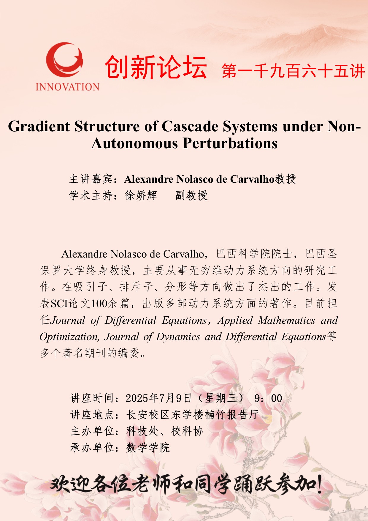 Alexandre Nolasco de Carvalho 教授 球速体育·(中国)官方网站QIUSU SPORTS创新论坛第一千九百六十五讲:Gradient Structure of Cascade Systems under Non-Autonomous Perturbations 讲座时间 2025年7月9日(星期三) 9:00 讲座地点 长安校区东学楼楠竹报告厅 讲座人介绍 Alexandre Nolasco de Carvalho 教授 讲座内容