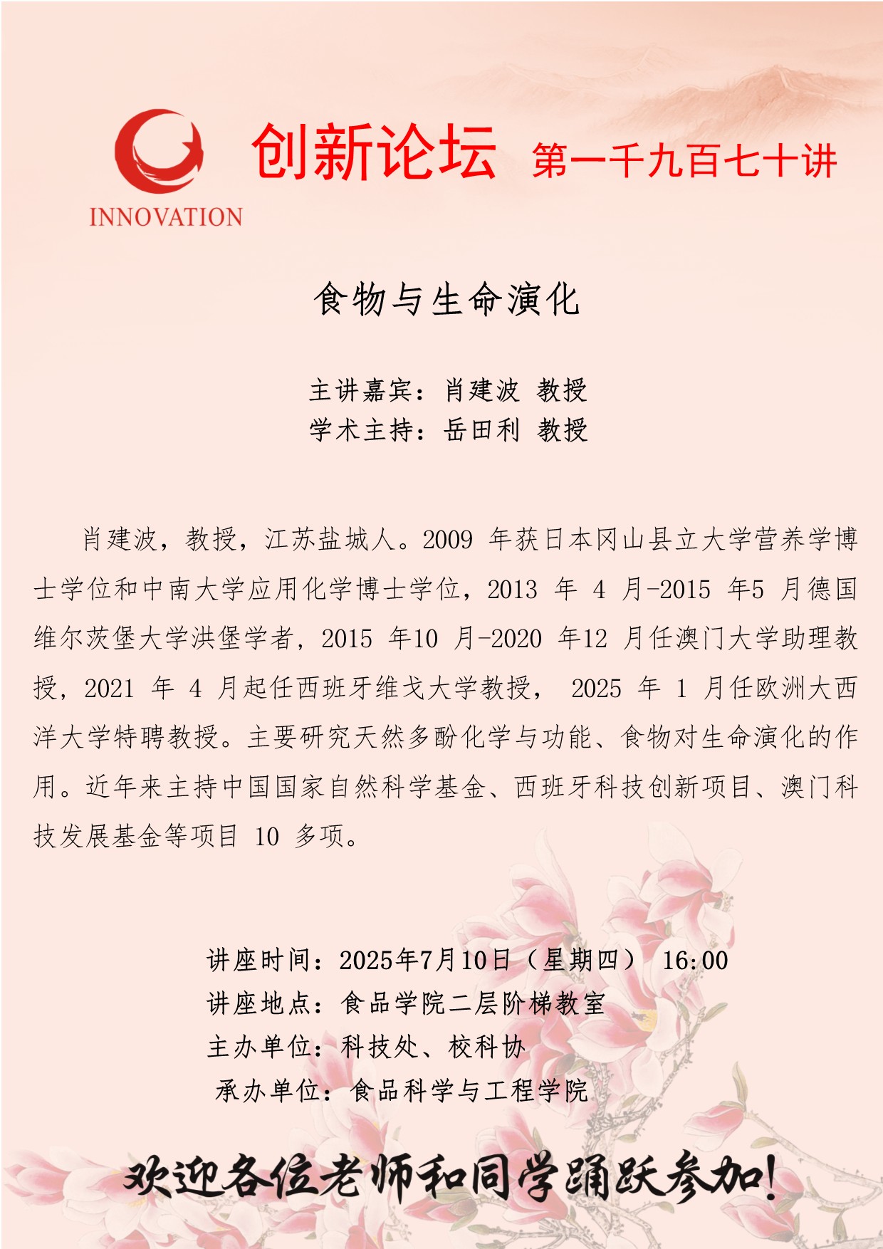 肖建波 教授 球速体育·(中国)官方网站QIUSU SPORTS创新论坛第一千九百七十讲: 食物与生命演化 讲座时间 2025年7月10日(星期四) 16:00 讲座地点 食品学院二层阶梯教室 讲座人介绍 肖建波 教授 讲座内容