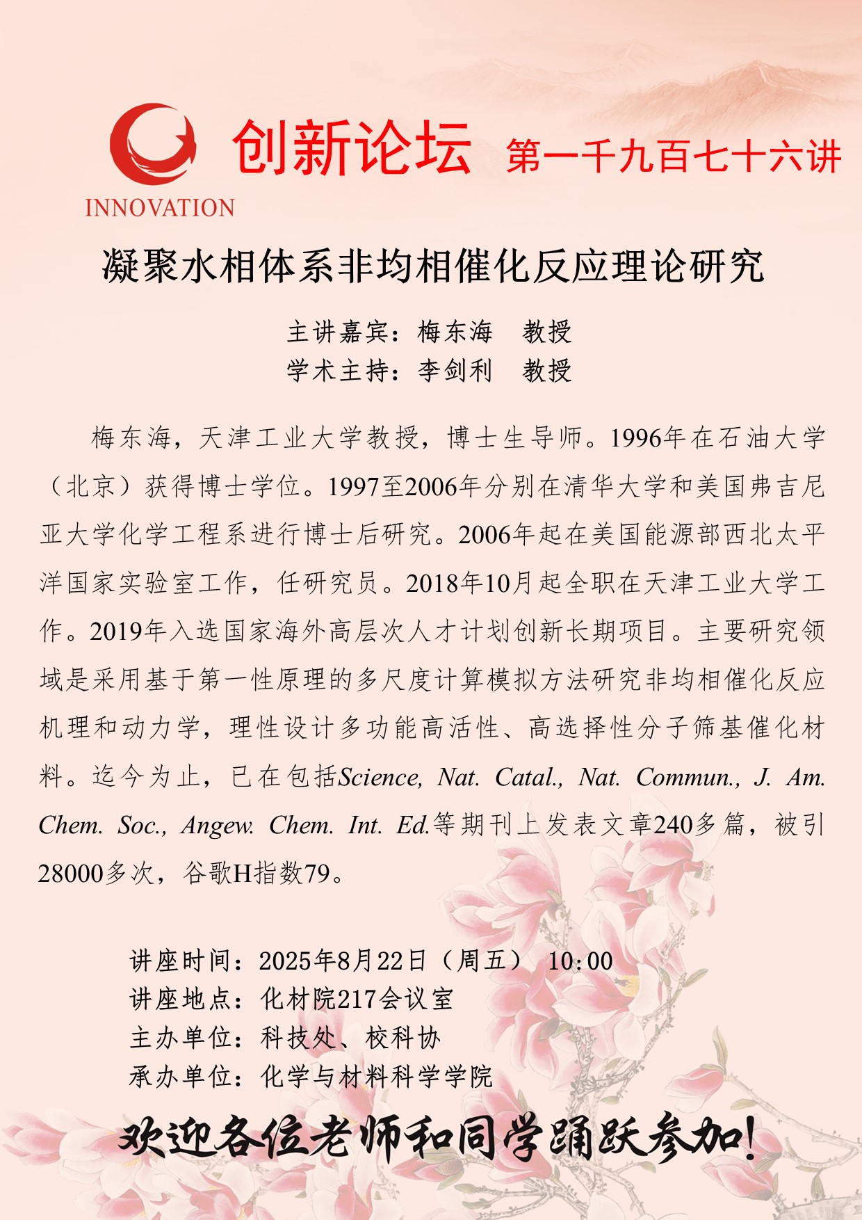 梅东海 教授 球速体育·(中国)官方网站QIUSU SPORTS创新论坛第一千九百七十六讲:凝聚水相体系非均相催化反应理论研究 讲座时间 2025年8月22日(星期五) 10:00 讲座地点 化材学院217智慧教室 讲座人介绍 梅东海 教授 讲座内容