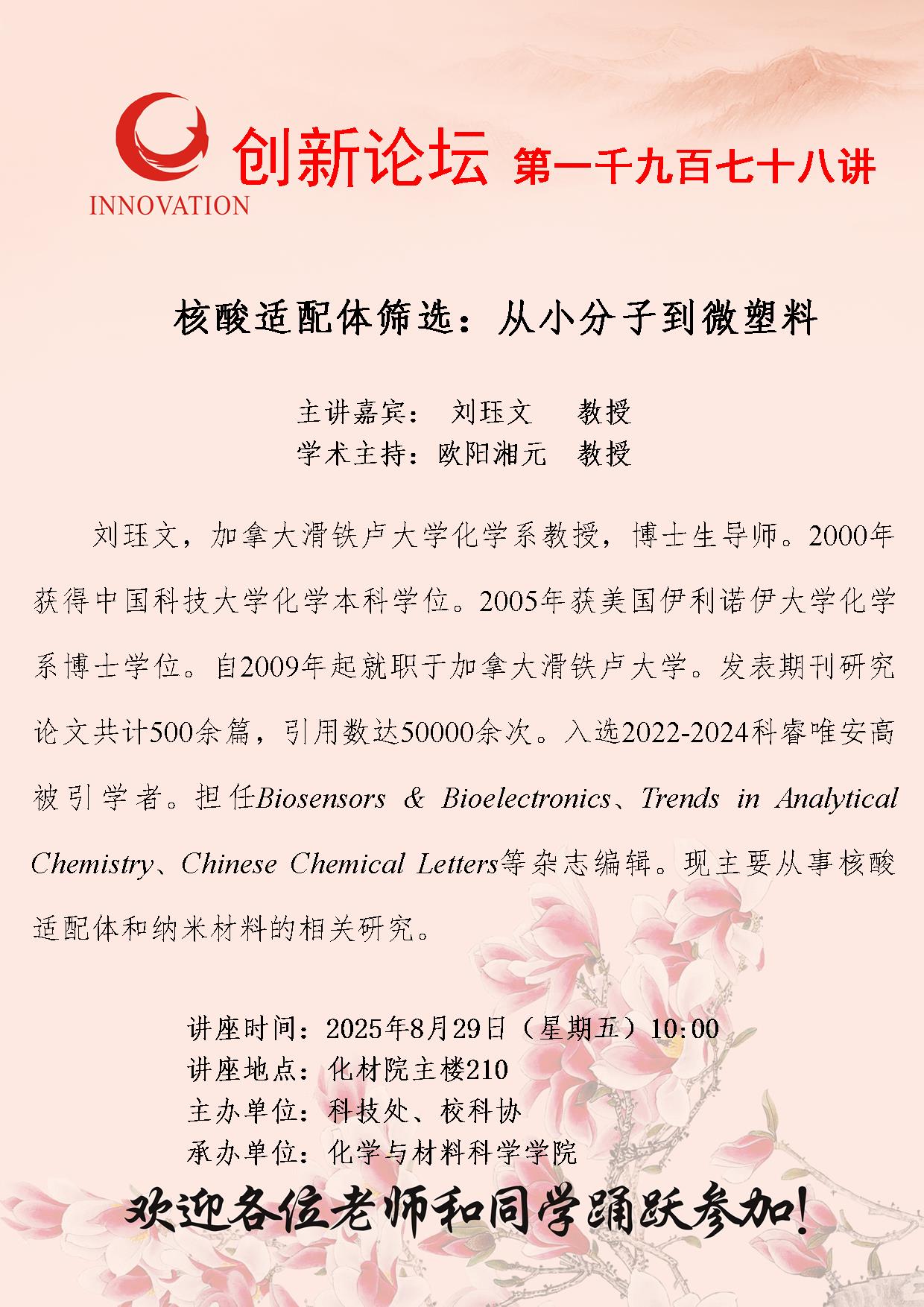 刘珏文 教授 球速体育·(中国)官方网站QIUSU SPORTS创新论坛第一千九百七十八讲:核酸适配体筛选:从小分子到微塑料 讲座时间 2025年8月29日(星期五)10:00 讲座地点 化材院主楼210 讲座人介绍 刘珏文 教授 讲座内容