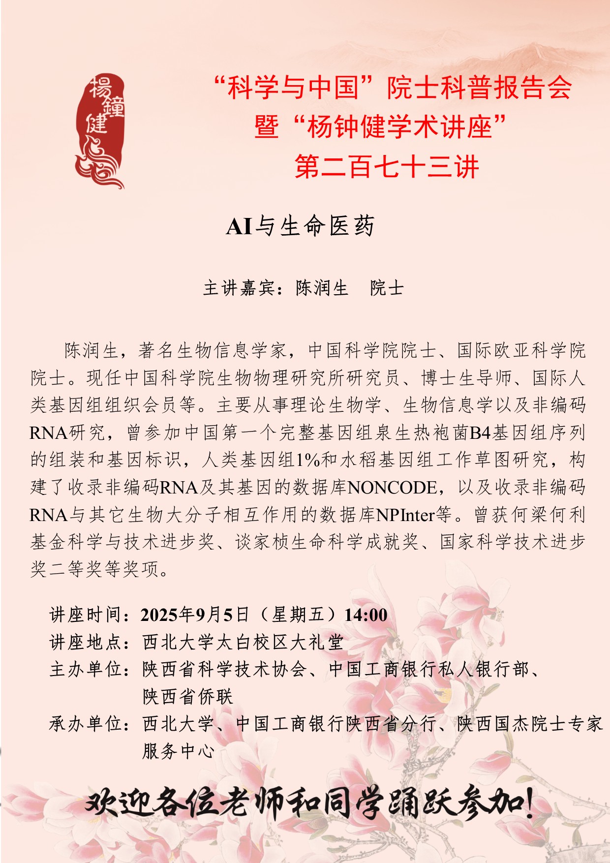 陈润生 院士 “科学与中国”院士科普报告会暨“杨钟健学术讲座”第二百七十三讲:AI与生命医药 讲座时间 2025年9月5日(星期五)14:00 讲座地点 球速体育·(中国)官方网站QIUSU SPORTS太白校区大礼堂 讲座人介绍 陈润生 院士 讲座内容