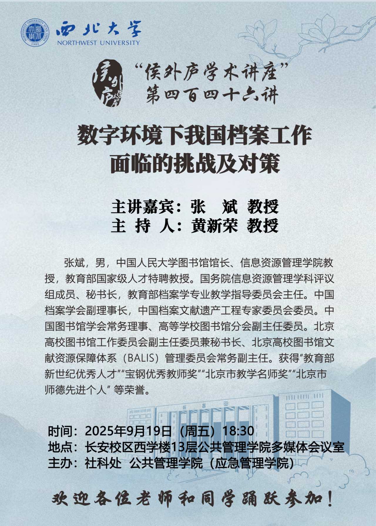 “侯外庐学术讲座”第四百四十六讲:数字环境下我国档案工作面临的挑战及对策