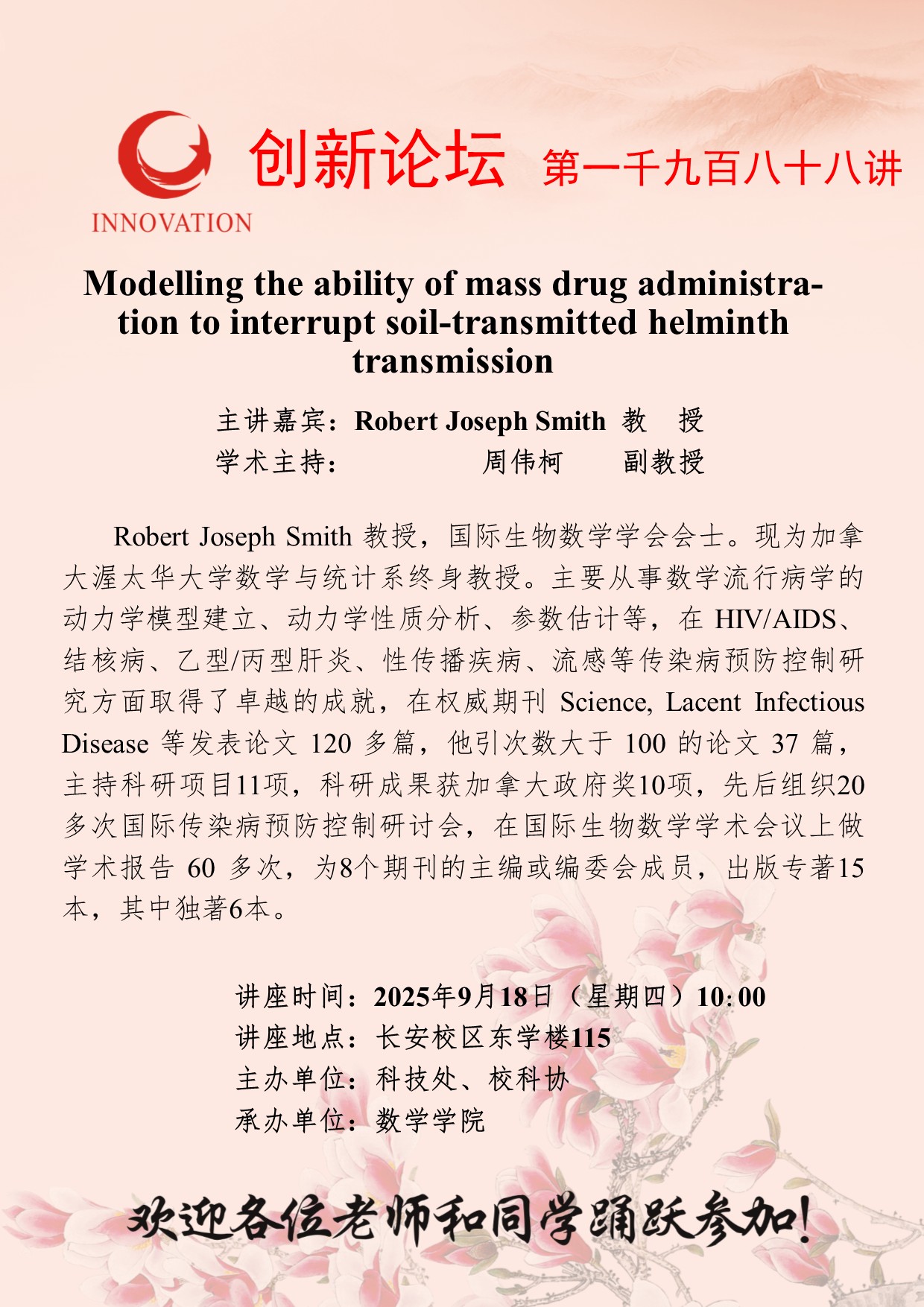Robert Joseph Smith 教授 球速体育·(中国)官方网站QIUSU SPORTS创新论坛第一千九百八十八讲:Modelling the ability of mass drug administration to interrupt soil-transmitted helminth transmission 讲座时间 2025年9月18日(星期四)10:00 讲座地点 长安校区东学楼115 讲座人介绍 Robert Joseph Smith 教授 讲座内容