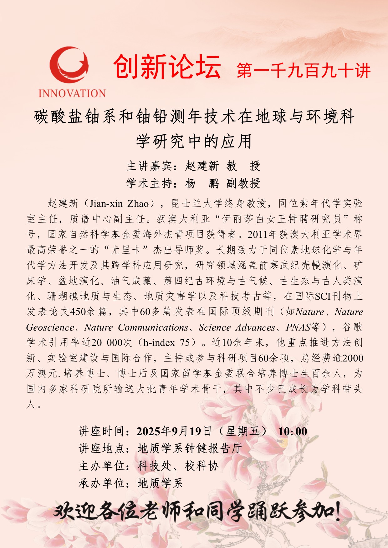 赵建新 教授 球速体育·(中国)官方网站QIUSU SPORTS创新论坛第一千九百九十讲:碳酸盐铀系和铀铅测年技术在地球与环境科学研究中的应用 讲座时间 2025年9月19日(星期五) 10:00 讲座地点 地质学系钟健报告厅 讲座人介绍 赵建新 教授 讲座内容