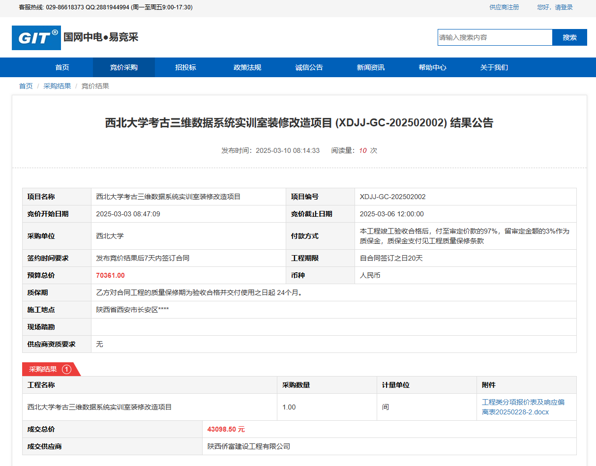 球速体育·(中国)官方网站QIUSU SPORTS考古三维数据系统实训室装修改造项目(XDJJ-GC-202502002)竞价结果公告 作者:采购与招标办公室 编辑: 时间:2025-03-10 原公告链接:https://www.ejingcai.com.cn/site/bidding/detail/16795