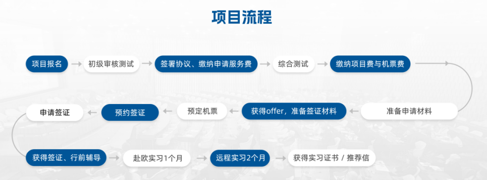 实习机构的匹配及安置(包括前期联络、背景审核、落实实习细节、最终确认)、学生能力综合评估(包括初级审核测试和综合测试)、实习申请服务(包括资料整理、审核、修改等)、境外住宿费、场地和交流活动费用、境外保险、因实习产生的境外交通费、签证辅导及预约、出行前培训、项目期间综合管理等。