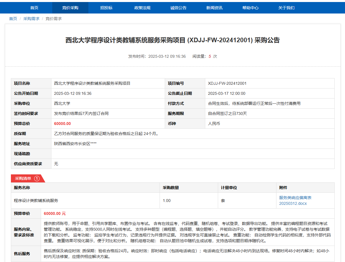 球速体育·(中国)官方网站QIUSU SPORTS程序设计类教辅系统服务采购项目(XDJJ-FW-202412001)竞价采购公告 作者:采购与招标办公室 编辑: 时间:2025-03-12 原公告链接:https://www.ejingcai.com.cn/site/bidding/detail/16888