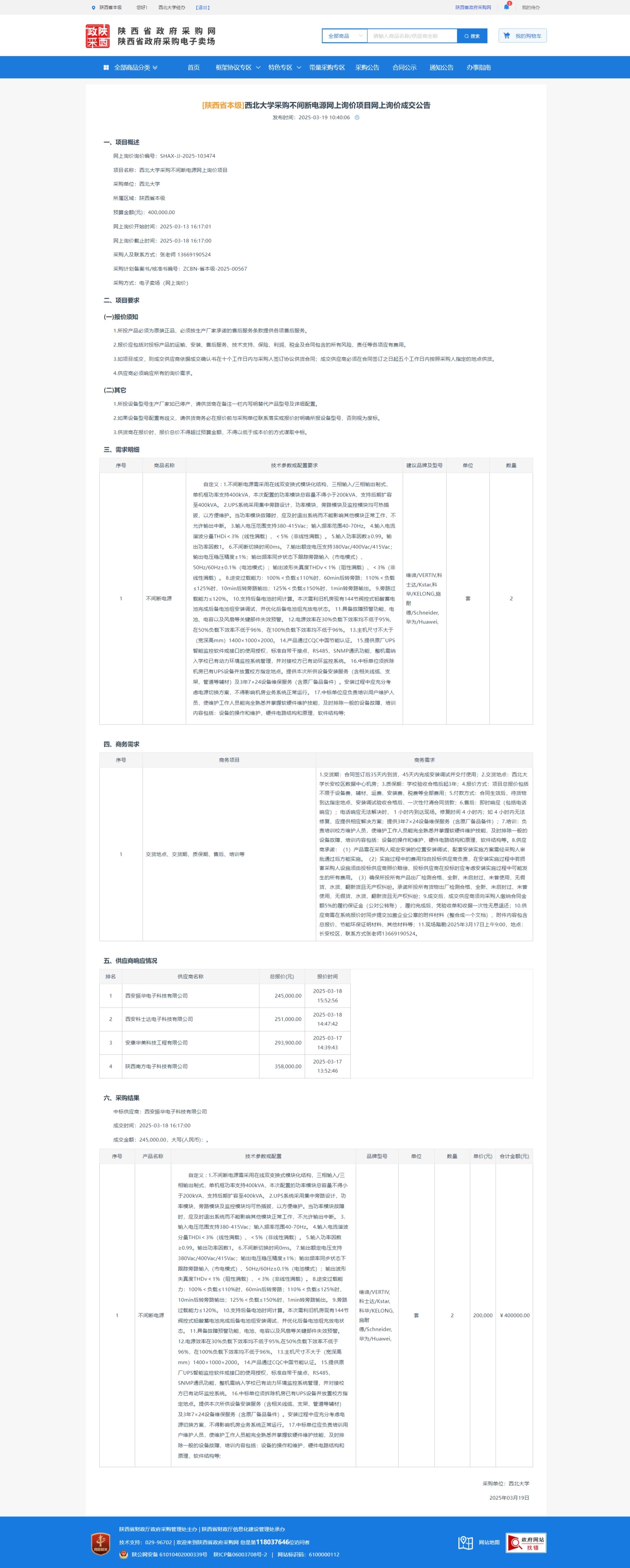 球速体育·(中国)官方网站QIUSU SPORTS采购不间断电源网上询价项目网上询价成交公告 作者: 编辑:采购与招标办公室 时间:2025-03-19 原公告链接:https://www.ccgp-shaanxi.gov.cn/gpmall-main-web/basic/noticeDetail?noticeGuid=7301336059869331456
