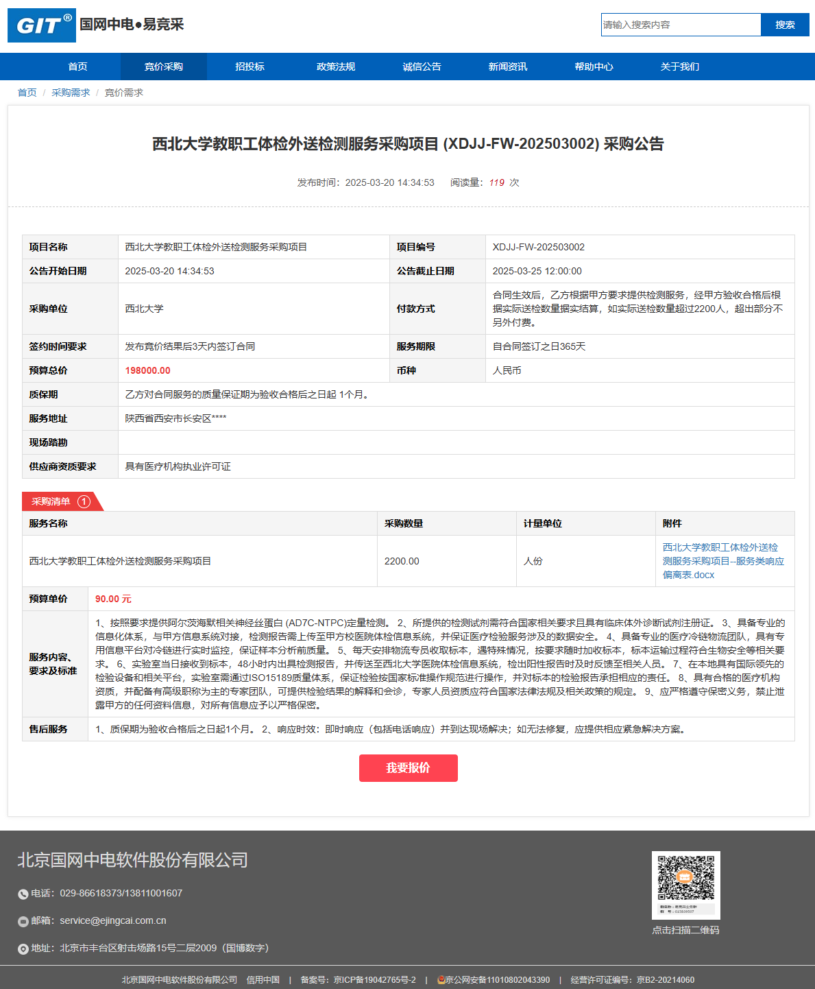 球速体育·(中国)官方网站QIUSU SPORTS教职工体检外送检测服务采购项目 (XDJJ-FW-202503002) 采购公告 作者:采购与招标办公室 编辑:张旭龙 时间:2025-03-20 原链接地址