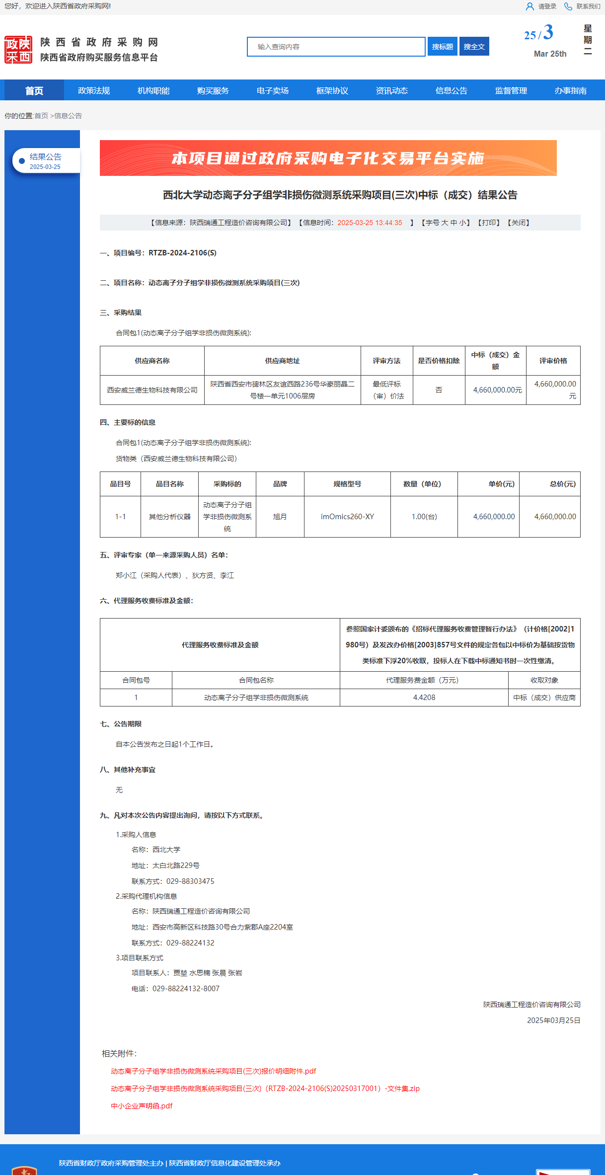 球速体育·(中国)官方网站QIUSU SPORTS动态离子分子组学非损伤微测系统采购项目(三次)中标(成交)结果公告 作者:采购与招标办公室 编辑: 时间:2025-03-25 原公告链接:http://www.ccgp-shaanxi.gov.cn/freecms/site/shaanxi/ggxx/info/2025/8a69c47e9566d36f0195cbcd06cf5bd8.html?noticeType=001025¬iceId=0c1c041c-093e-11f0-8063-08c0eb20c666
