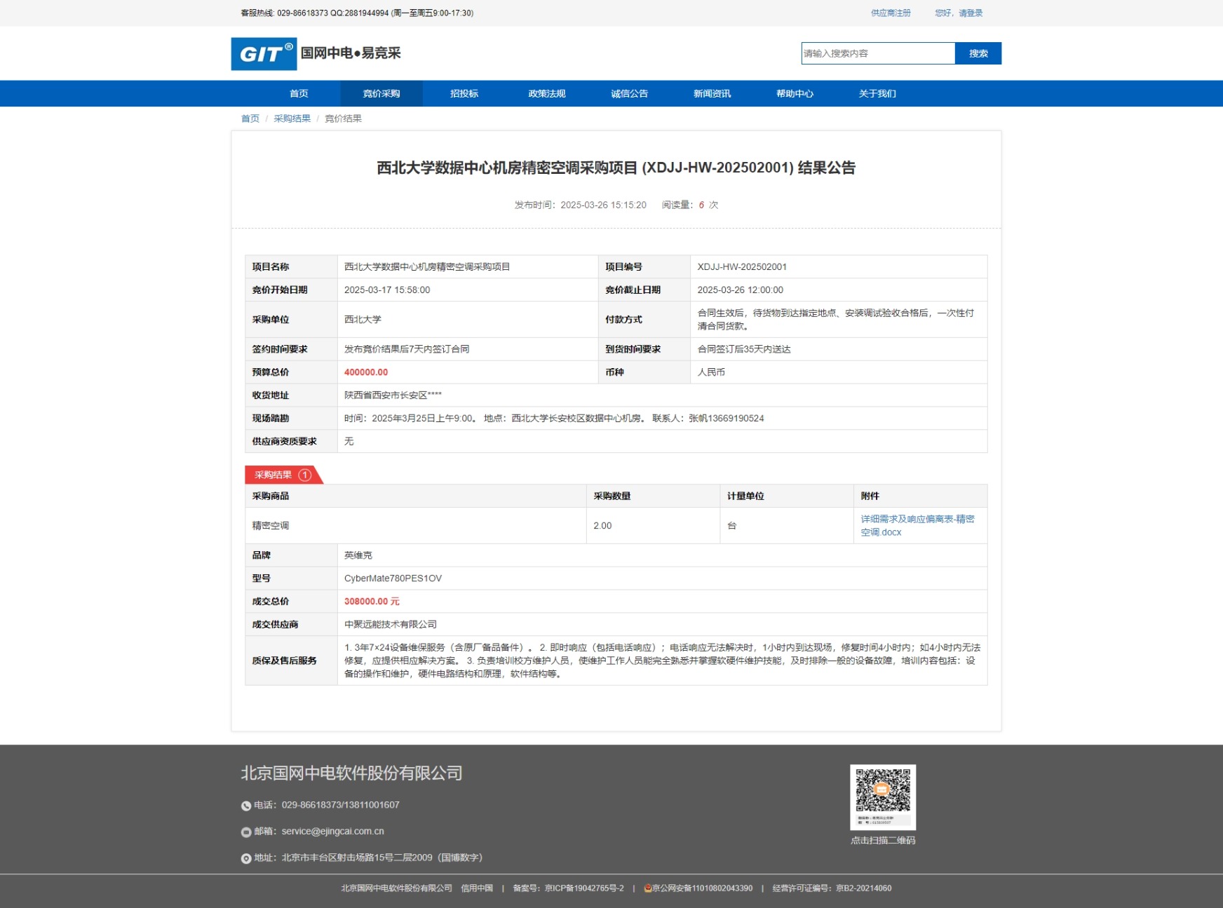 球速体育·(中国)官方网站QIUSU SPORTS数据中心机房精密空调采购项目 (XDJJ-HW-202502001)竞价结果公告 作者: 编辑:采购与招标办公室 时间:2025-03-26 原公告链接:https://www.ejingcai.com.cn/site/bidding/detail/17207