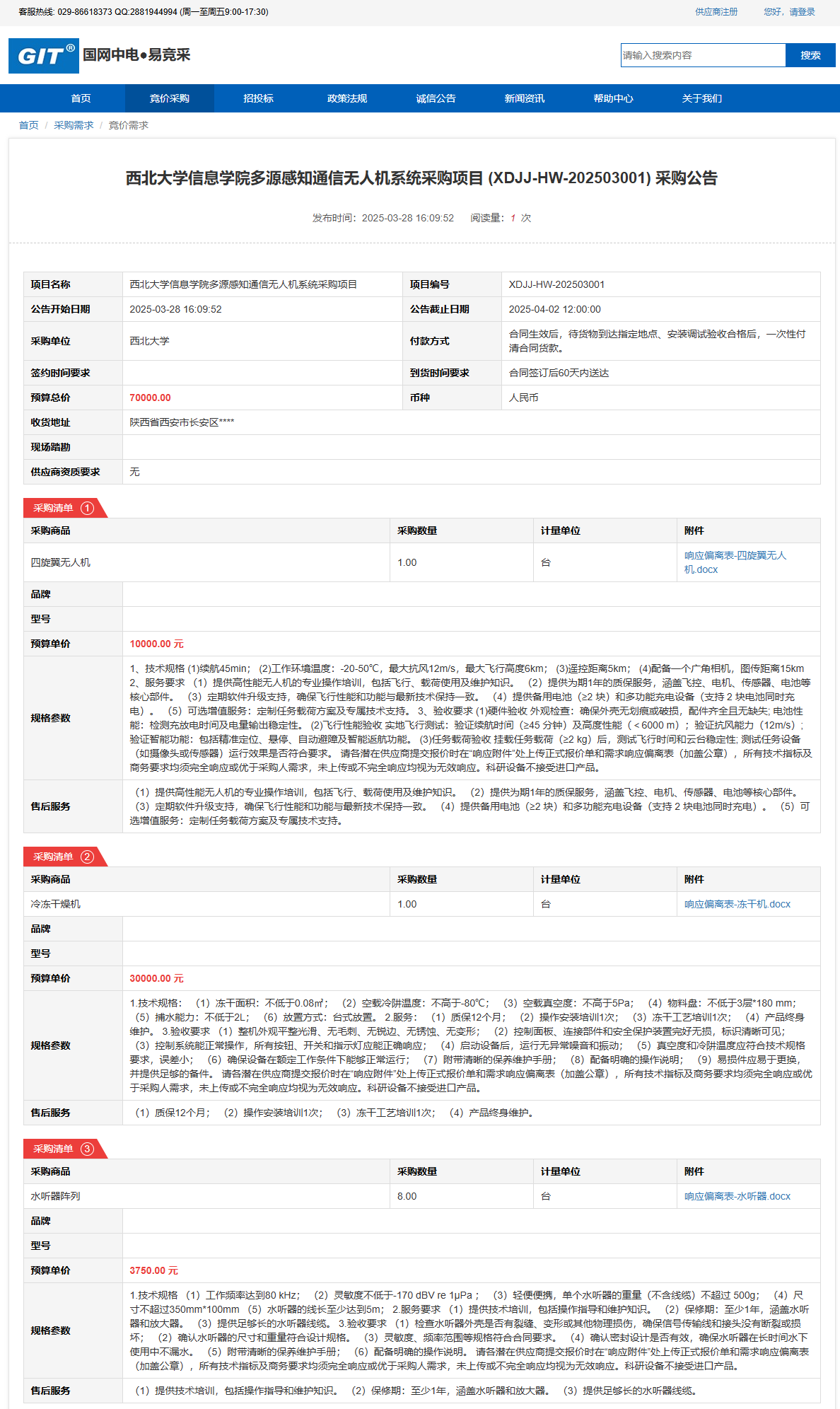 球速体育·(中国)官方网站QIUSU SPORTS信息学院多源感知通信无人机系统采购项目(XDJJ-HW-202503001)竞价采购公告 作者:采购与招标办公室 编辑: 时间:2025-03-28 原公告链接:https://www.ejingcai.com.cn/site/bidding/detail/17255