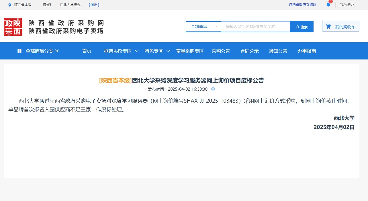 球速体育·(中国)官方网站QIUSU SPORTS采购深度学习服务器网上询价项目废标公告 作者:采购与招标办公室 编辑: 时间:2025-04-02 原公告链接:https://www.ccgp-shaanxi.gov.cn/gpmall-main-web/basic/noticeDetail?noticeGuid=7306497670795952128