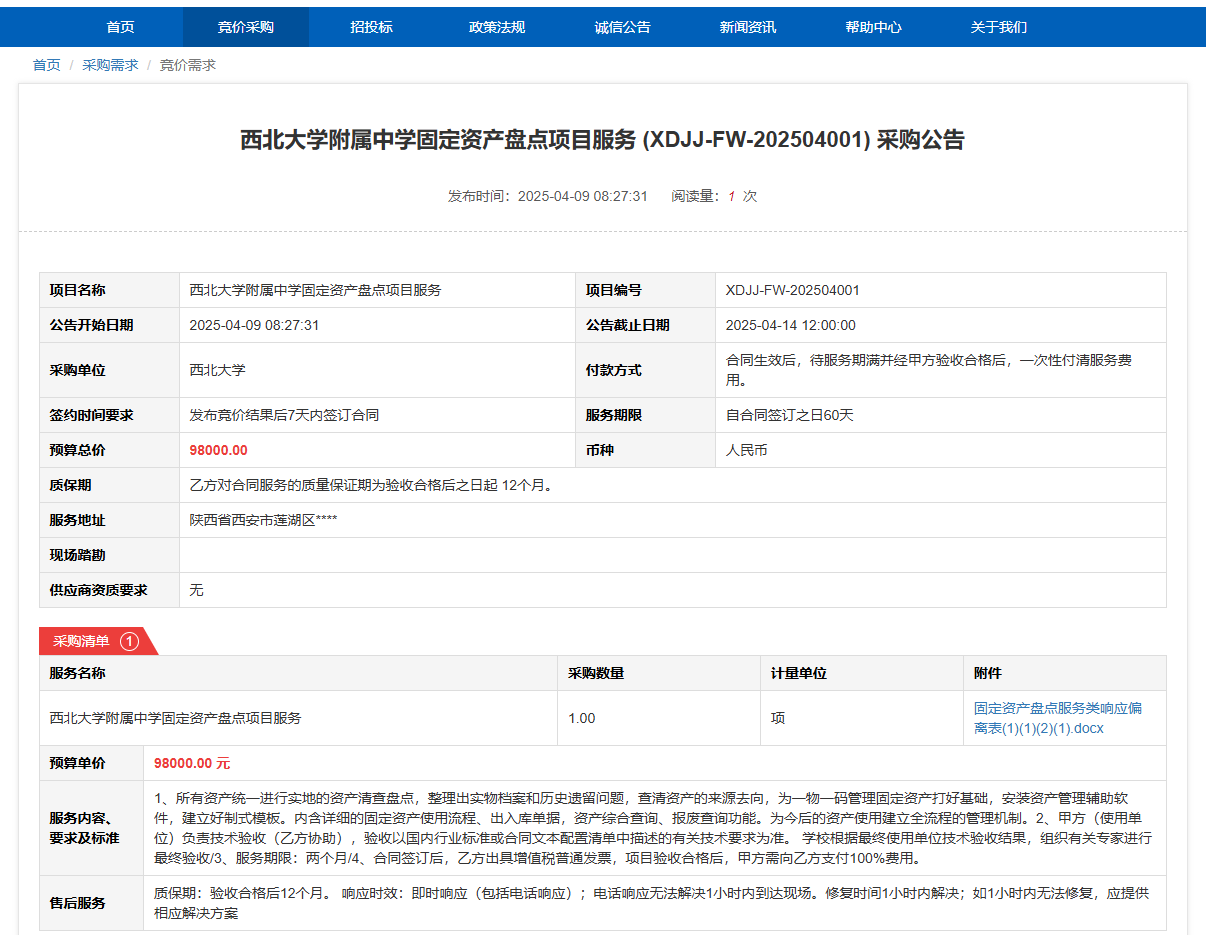 球速体育·(中国)官方网站QIUSU SPORTS附属中学固定资产盘点项目服务(XDJJ-FW-202504001)竞价采购公告 作者:采购与招标办公室 编辑: 时间:2025-04-09 原公告链接:https://www.ejingcai.com.cn/site/bidding/detail/17501