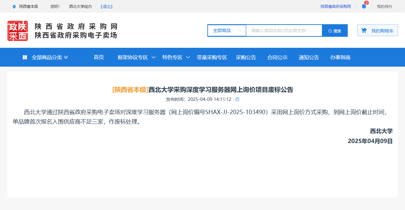 球速体育·(中国)官方网站QIUSU SPORTS采购深度学习服务器网上询价项目废标公告 作者:采购与招标办公室 编辑: 时间:2025-04-09 原公告链接:https://www.ccgp-shaanxi.gov.cn/gpmall-main-web/basic/noticeDetail?noticeGuid=7308999329707130880
