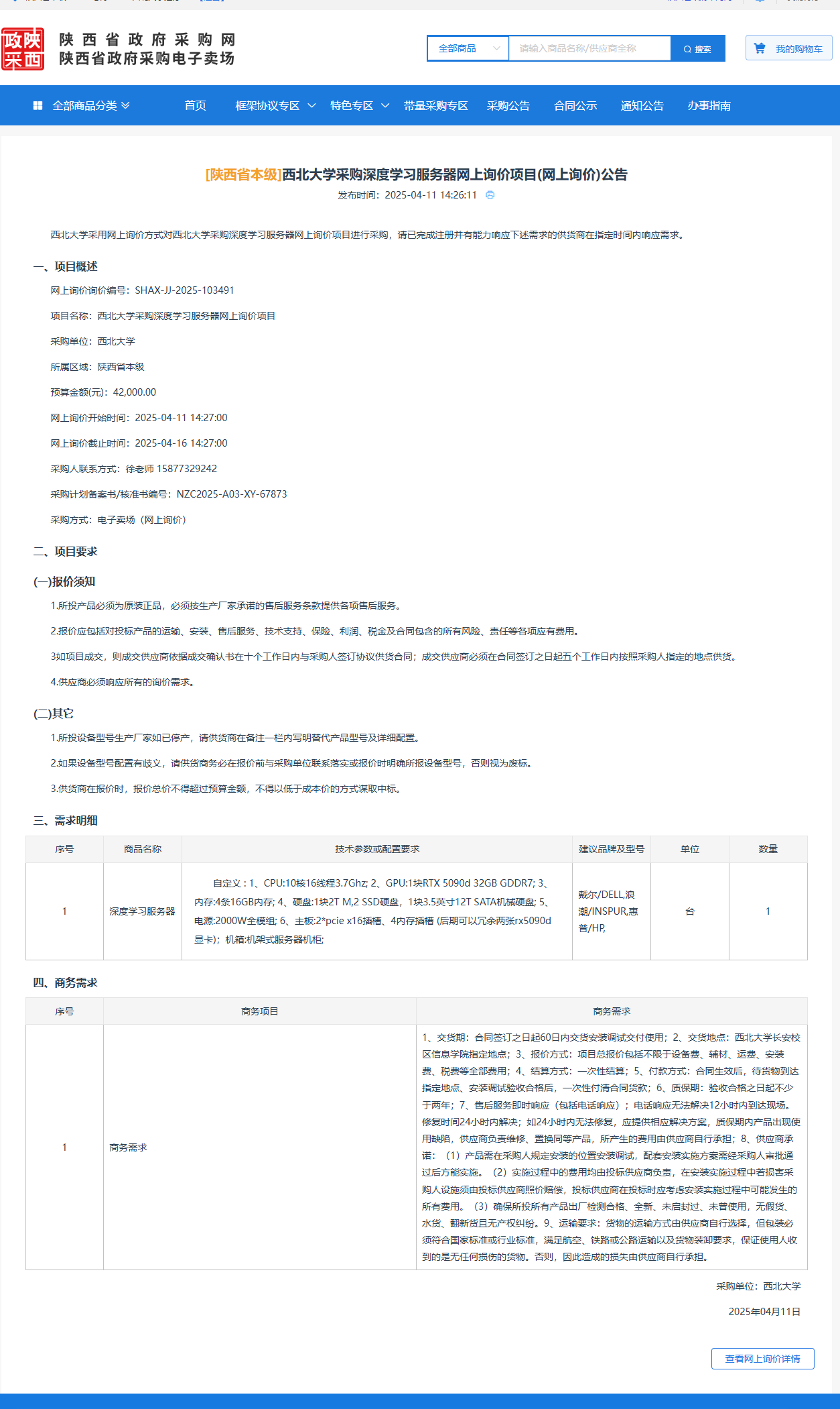 球速体育·(中国)官方网站QIUSU SPORTS采购深度学习服务器网上询价项目(网上询价)公告 作者:采购与招标办公室 编辑: 时间:2025-04-11 原公告链接:https://www.ccgp-shaanxi.gov.cn/gpmall-main-web/basic/noticeDetail?noticeGuid=7309727879137525760