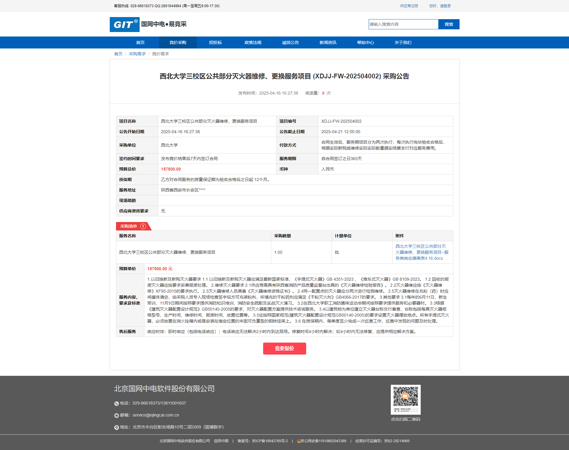球速体育·(中国)官方网站QIUSU SPORTS三校区公共部分灭火器维修、更换服务项目 (XDJJ-FW-202504002) 采购公告 作者:采购与招标办公室 编辑:张旭龙 时间:2025-04-16 原链接地址