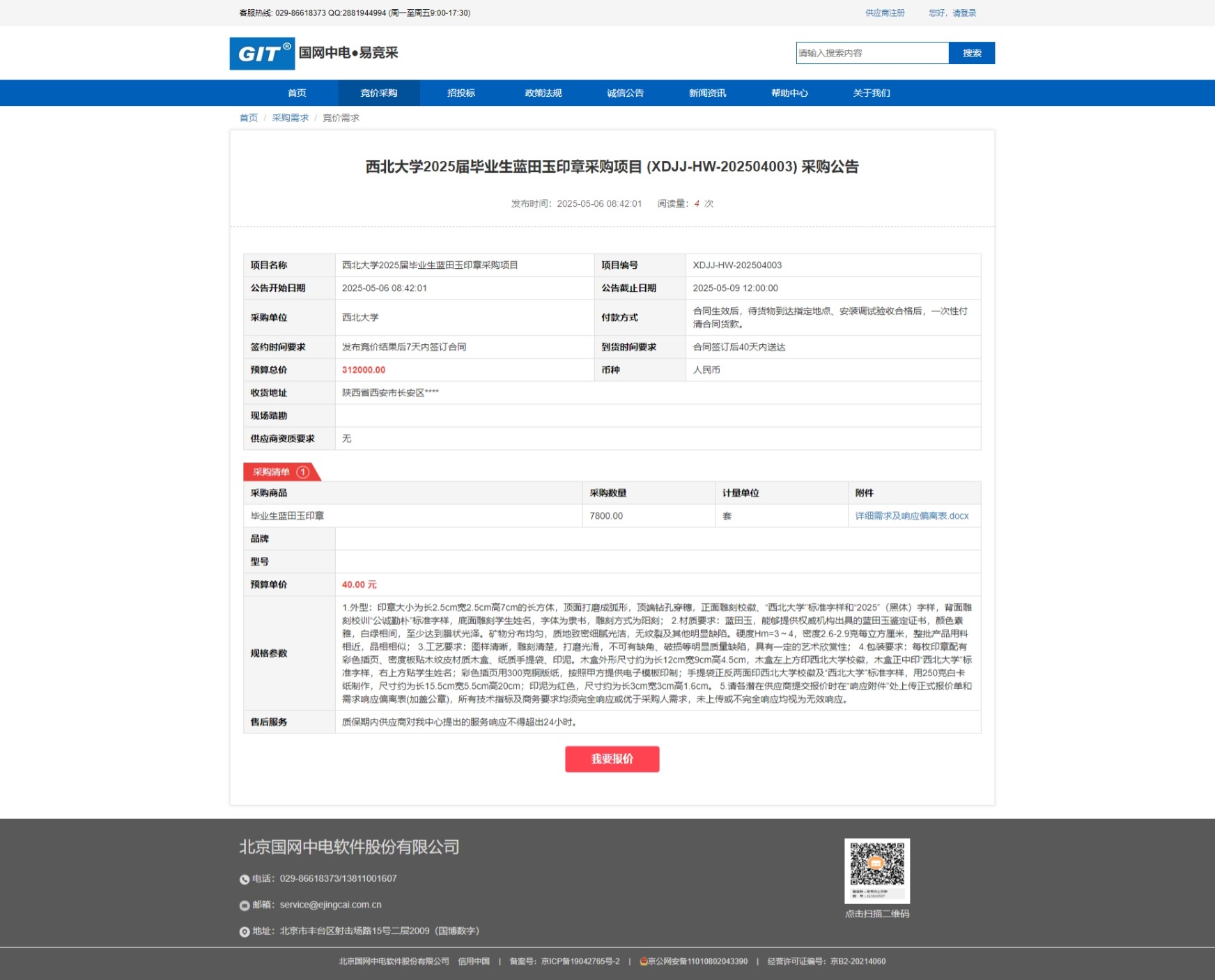 球速体育·(中国)官方网站QIUSU SPORTS2025届毕业生蓝田玉印章采购项目 (XDJJ-HW-202504003) 竞价采购公告 作者: 编辑:采购与招标办公室 时间:2025-05-06 原公告链接:https://www.ejingcai.com.cn/site/bidding/detail/18026