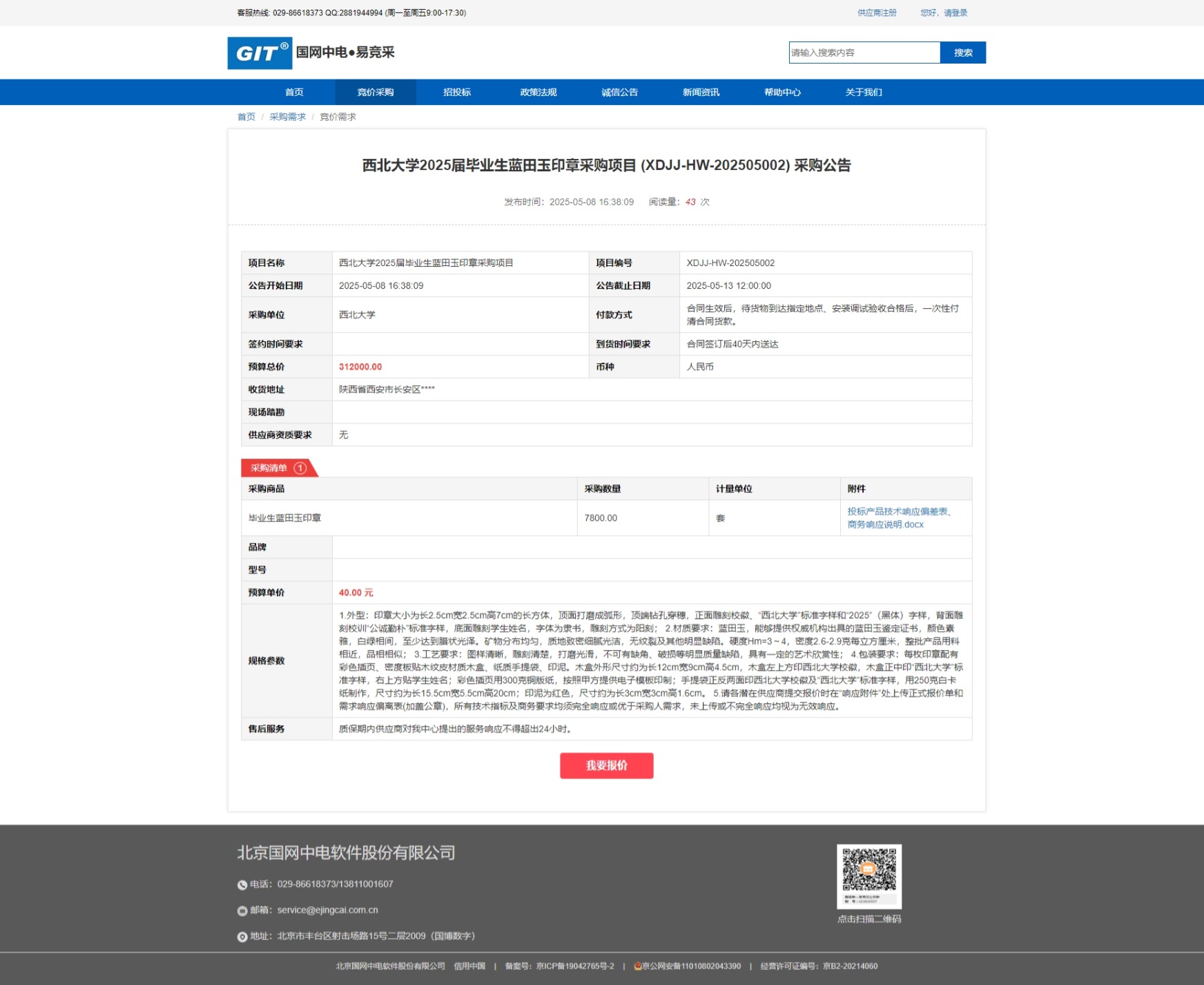 球速体育·(中国)官方网站QIUSU SPORTS2025届毕业生蓝田玉印章采购项目 (XDJJ-HW-202505002) 竞价采购公告 作者: 编辑:采购与招标办公室 时间:2025-05-09 原公告链接:https://www.ejingcai.com.cn/site/bidding/detail/18114