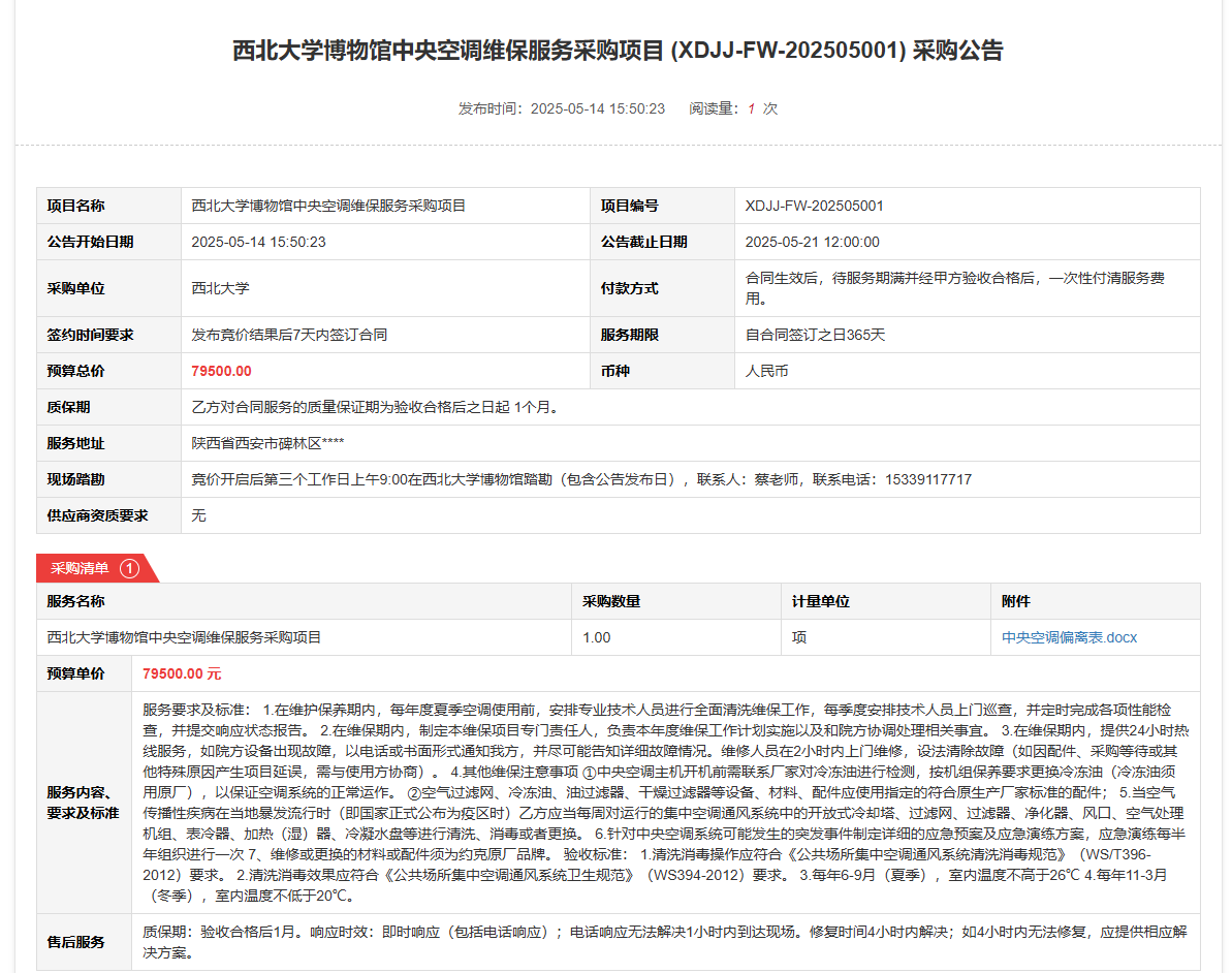 球速体育·(中国)官方网站QIUSU SPORTS博物馆中央空调维保服务采购项目(XDJJ-FW-202505001)竞价采购公告 作者:采购与招标办公室 编辑: 时间:2025-05-14 原公告链接:https://www.ejingcai.com.cn/site/bidding/detail/18217