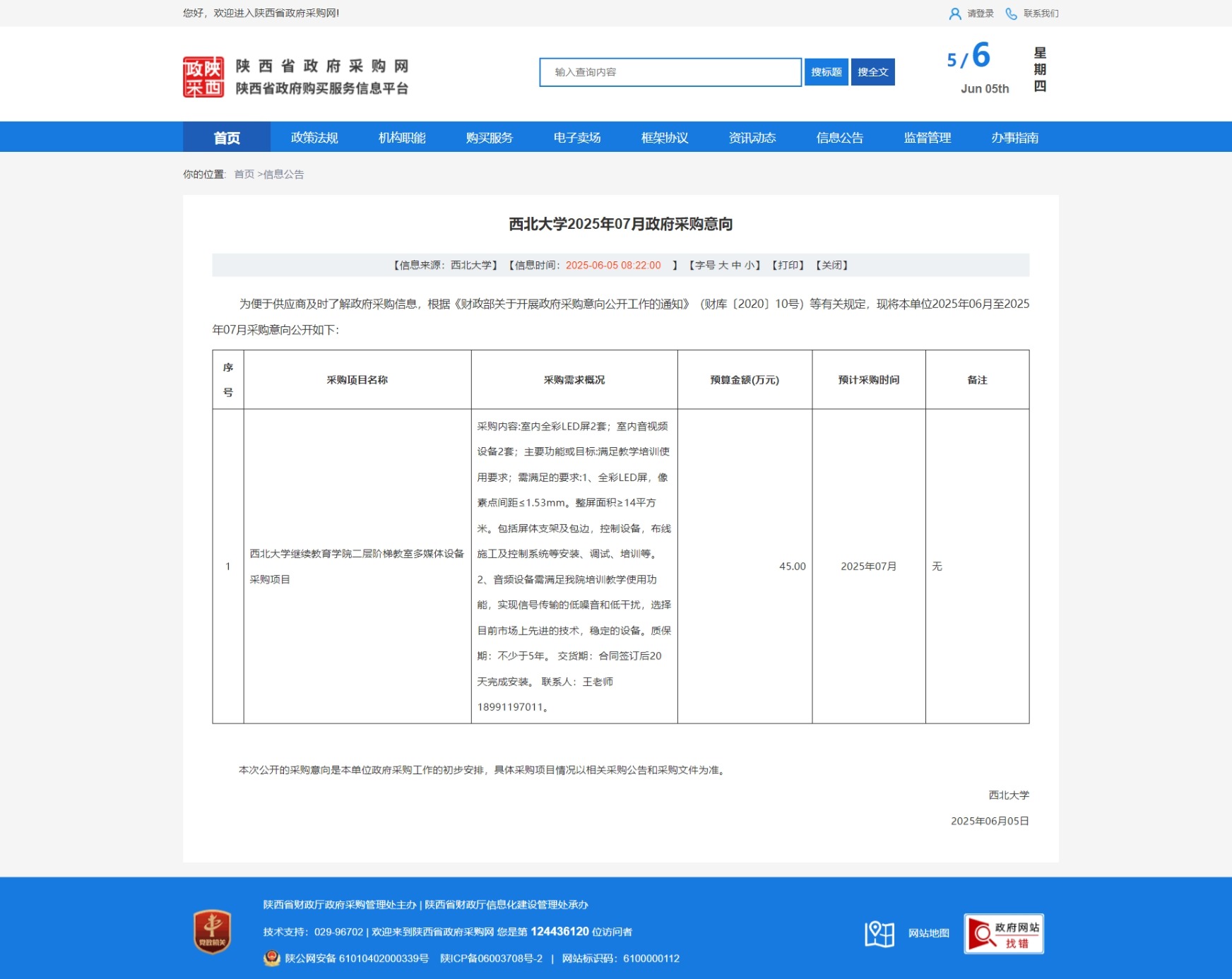 球速体育·(中国)官方网站QIUSU SPORTS2025年07月政府采购意向 作者: 编辑:采购与招标办公室 时间:2025-06-05 原公告链接:https://www.ccgp-shaanxi.gov.cn/freecms/site/shaanxi/ggxx/info/2025/8a69c8d196ce440a01973d667fcf58b5.html?noticeType=59¬iceId=0a572344-41a5-11f0-8063-08c0eb20c666