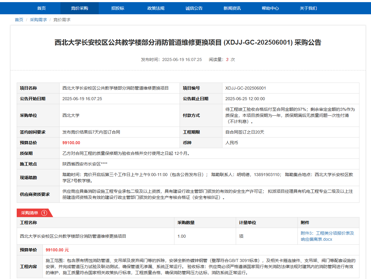 球速体育·(中国)官方网站QIUSU SPORTS长安校区公共教学楼部分消防管道维修更换项目(XDJJ-GC-202506001)竞价采购公告 作者:采购与招标办公室 编辑: 时间:2025-06-19 原公告链接:https://www.ejingcai.com.cn/site/bidding/detail/19038
