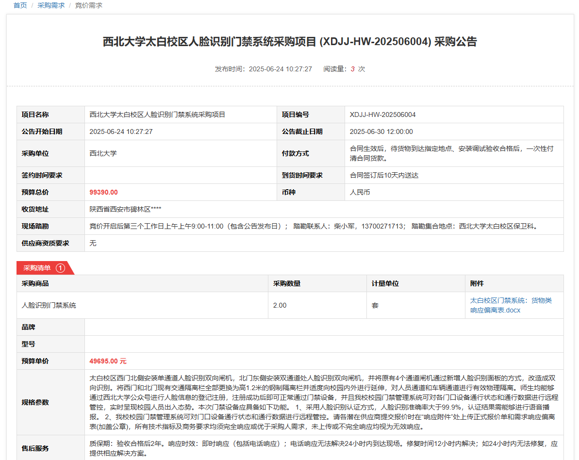 球速体育·(中国)官方网站QIUSU SPORTS太白校区人脸识别门禁系统采购项目(XDJJ-HW-202506004)竞价采购公告 作者: 编辑: 时间:2025-06-24 原公告链接:https://www.ejingcai.com.cn/site/bidding/detail/19128