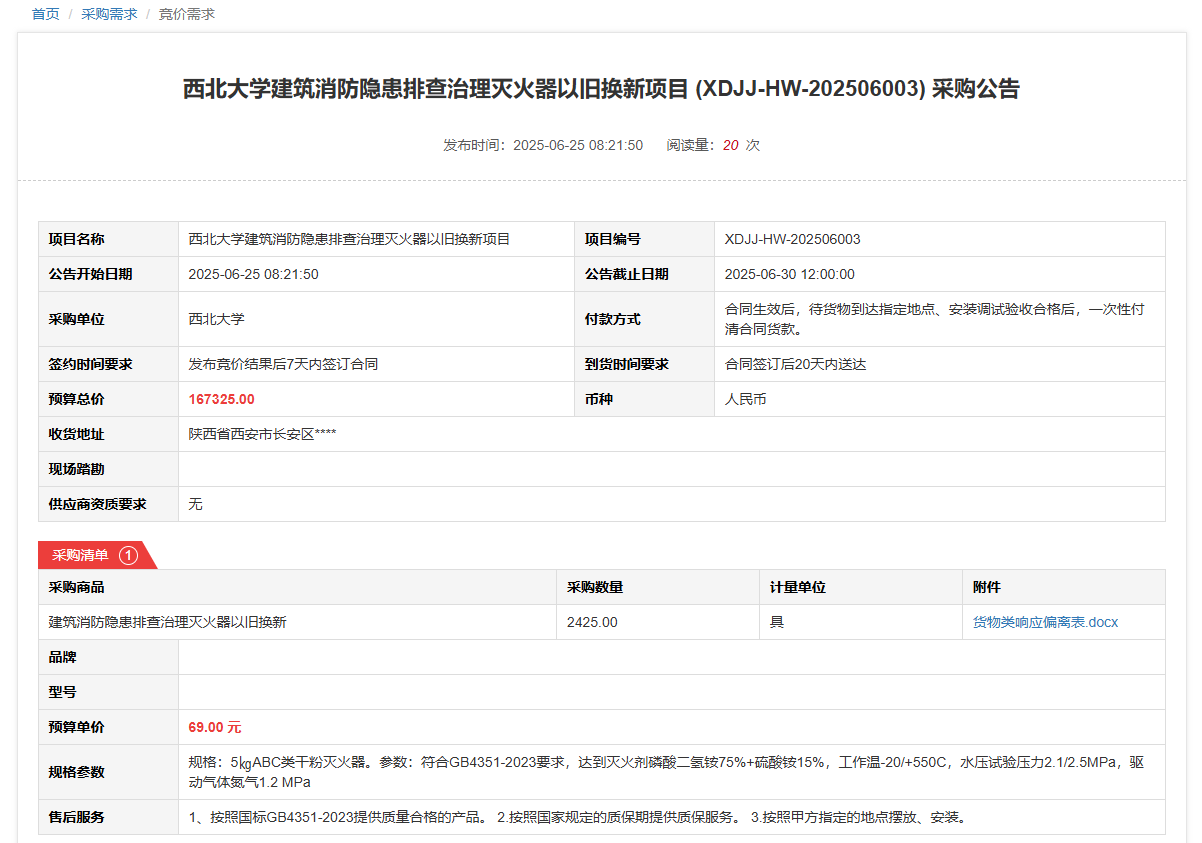 球速体育·(中国)官方网站QIUSU SPORTS建筑消防隐患排查治理灭火器以旧换新项目(XDJJ-HW-202506003)竞价采购公告 作者:采购与招标办公室 编辑: 时间:2025-06-25 原公告链接:https://www.ejingcai.com.cn/site/bidding/detail/19167