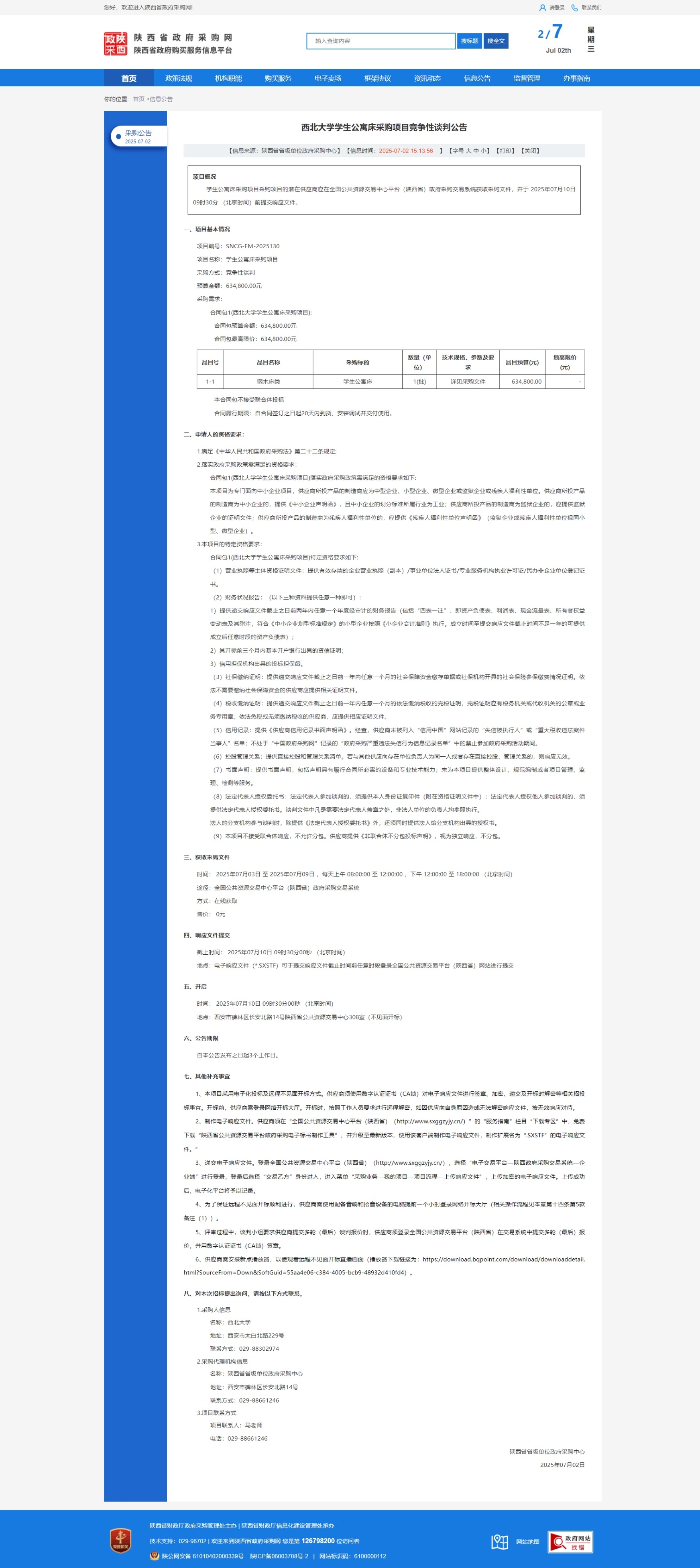 球速体育·(中国)官方网站QIUSU SPORTS学生公寓床采购项目竞争性谈判公告 作者: 编辑:采购与招标办公室 时间:2025-07-02 原公告链接:https://www.ccgp-shaanxi.gov.cn/freecms/site/shaanxi/ggxx/info/2025/8a69c67497a9ff030197c8e900a9510c.html?noticeType=001013¬iceId=1bd2af55-5716-11f0-8063-08c0eb20c666