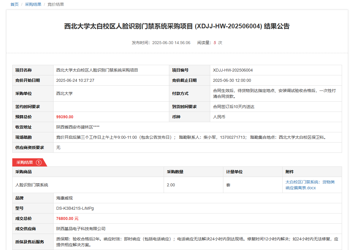 球速体育·(中国)官方网站QIUSU SPORTS太白校区人脸识别门禁系统采购项目(XDJJ-HW-202506004)竞价结果公告 作者:采购与招标办公室 编辑: 时间:2025-06-30 原公告链接:https://www.ejingcai.com.cn/site/bidding/detail/19250