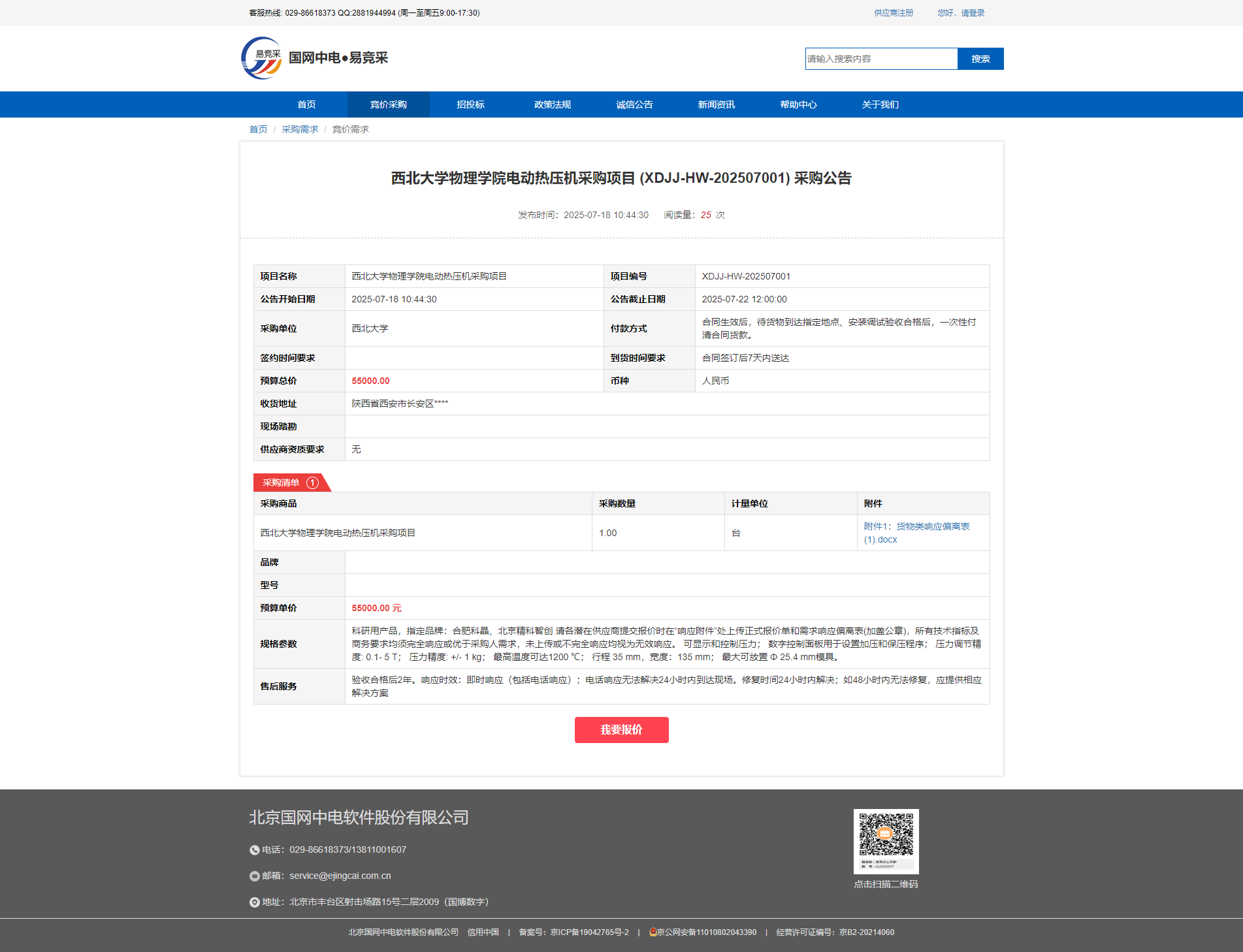 球速体育·(中国)官方网站QIUSU SPORTS物理学院电动热压机采购项目(XDJJ-HW-202507001)竞价采购公告 作者:采购与招标办公室 编辑:张旭龙 时间:2025-07-18 原链接地址