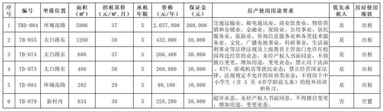 重要信息披露:1.本次评估结果中市场租赁价格为含税价格,相关税费包括房产税、增值税及附加等;2.部分房屋目前在租,由出租方负责落实资产交付相关事项;原租户在同等条件下享有优先承租权,且应在挂牌期间向交易所递交承租申请并进行场内行权;3.意向承租方需先对标的进行全面的尽职调查,完全认可标的现状,同时向交易所递交经出租方盖章的《承诺函》后,方可进行报名;;4.其他信息详见交易所备查资料。