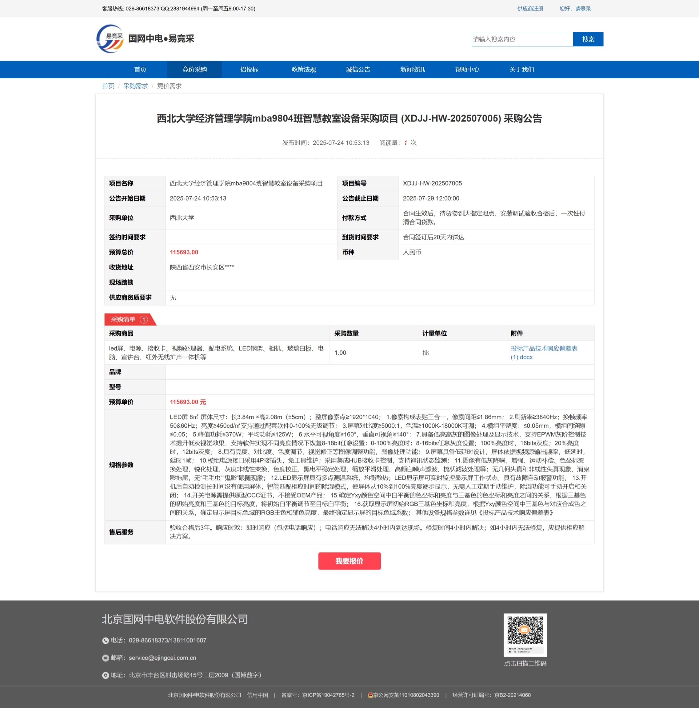 球速体育·(中国)官方网站QIUSU SPORTS经济管理学院mba9804班智慧教室设备采购项目 (XDJJ-HW-202507005)竞价采购公告 作者: 编辑:薛利娟 时间:2025-07-24 原公告链接:https://www.ejingcai.com.cn/site/bidding/detail/19708