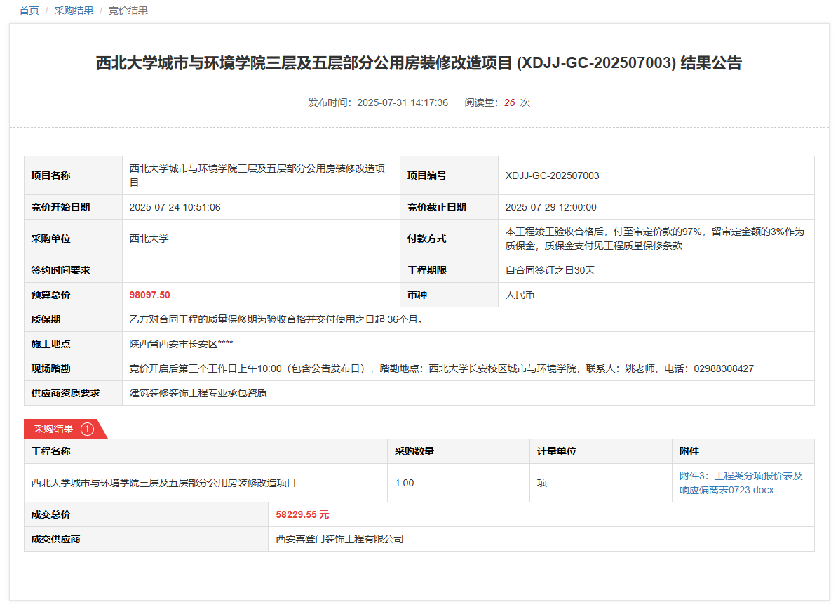 球速体育·(中国)官方网站QIUSU SPORTS城市与环境学院三层及五层部分公用房装修改造项目(XDJJ-GC-202507003)竞价结果公告 作者:采购与招标办公室 编辑: 时间:2025-07-31 原公告链接